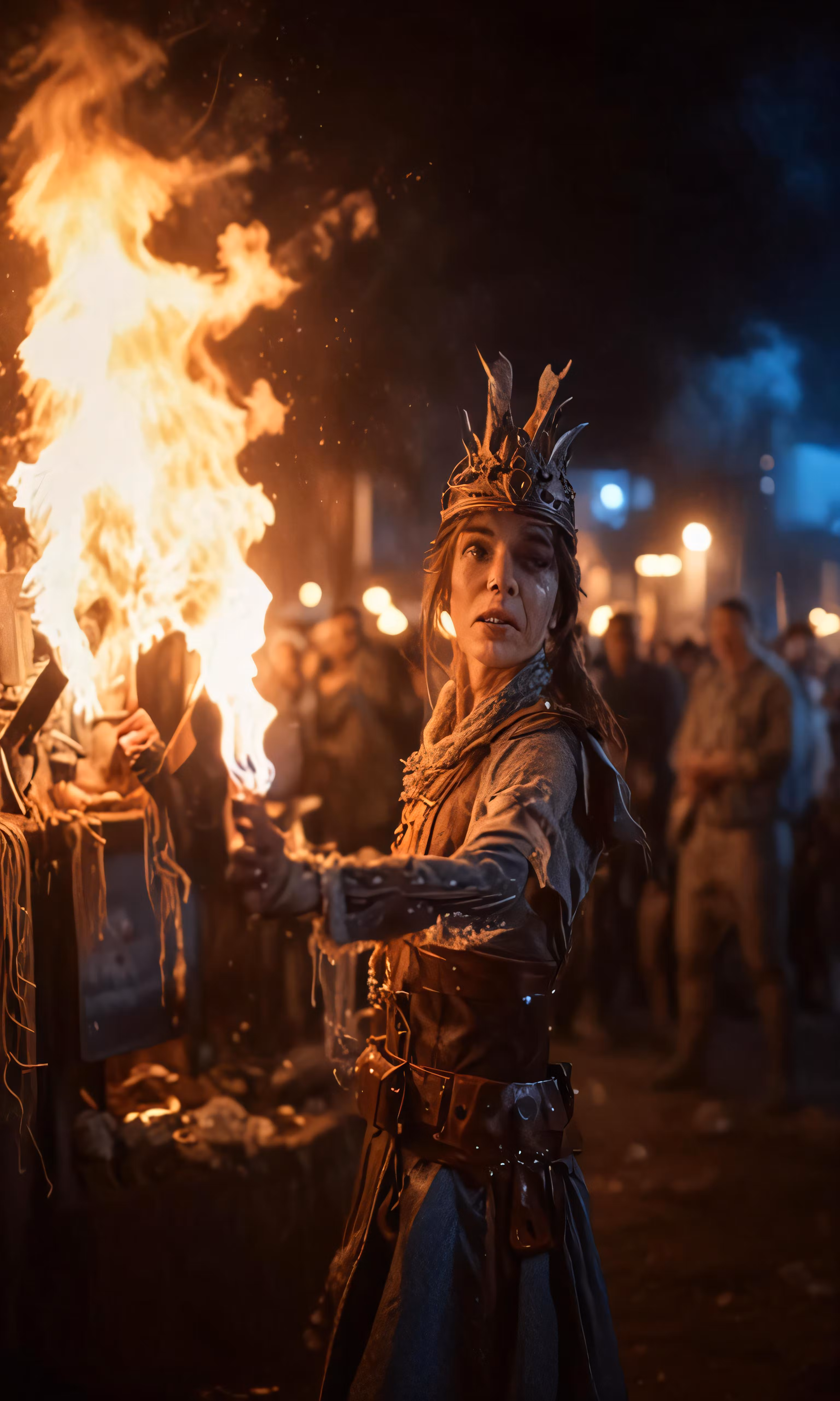 High resolution picture, free to use, a man in armor holds fire as others stand outside