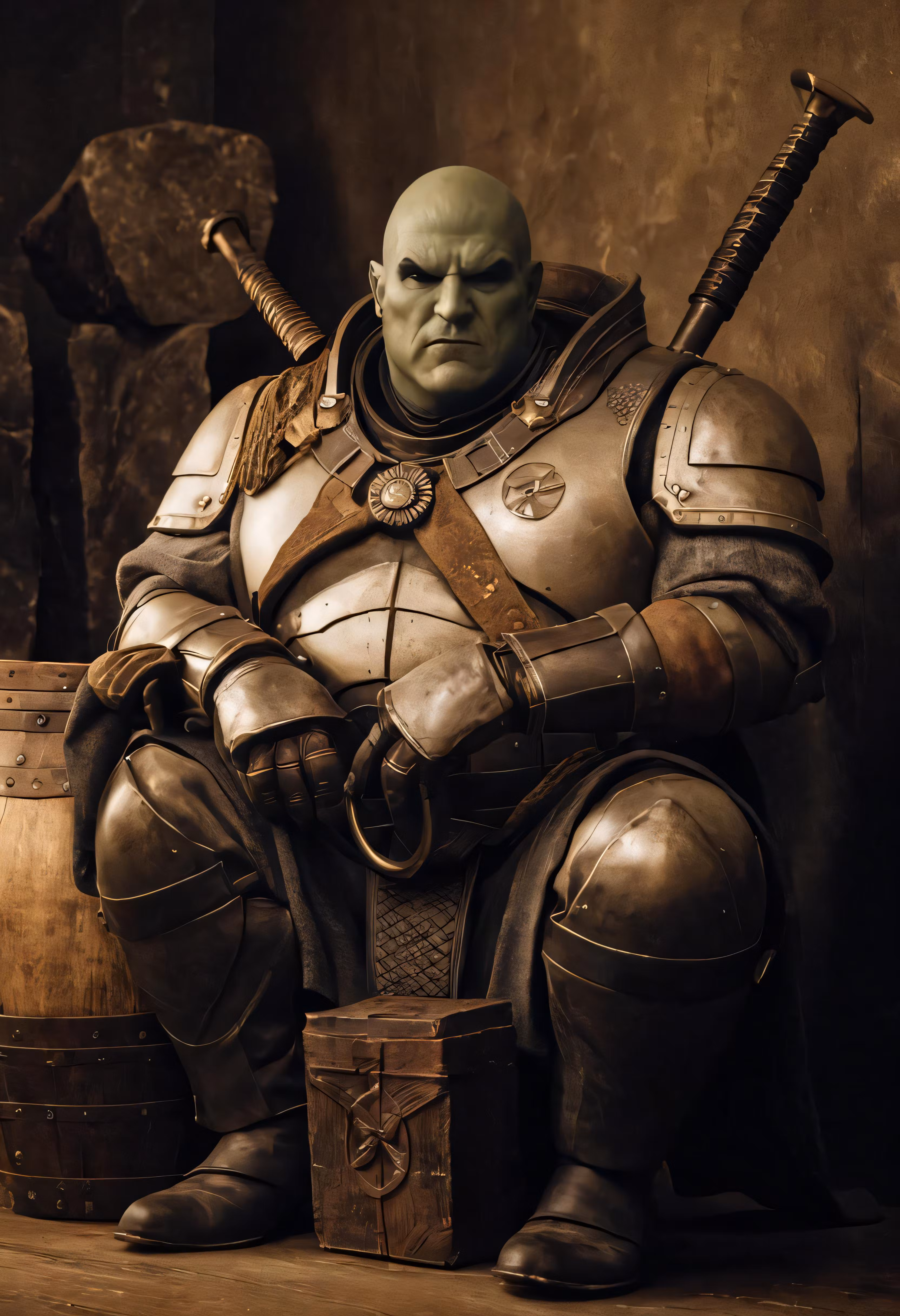 High resolution picture, free to use, a man in armor holds two swords next to a chest