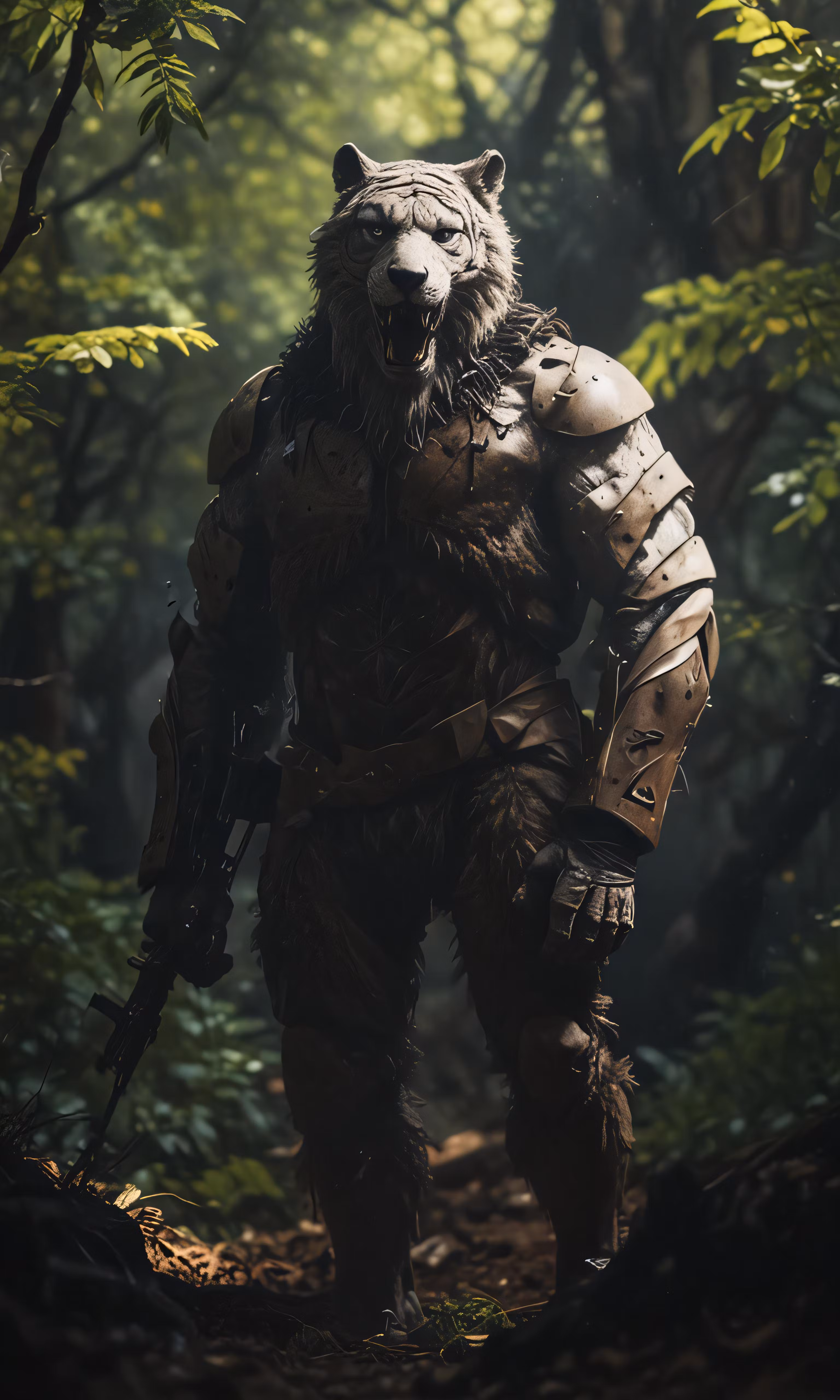 High resolution picture, free to use, a man in armor walking through a forest