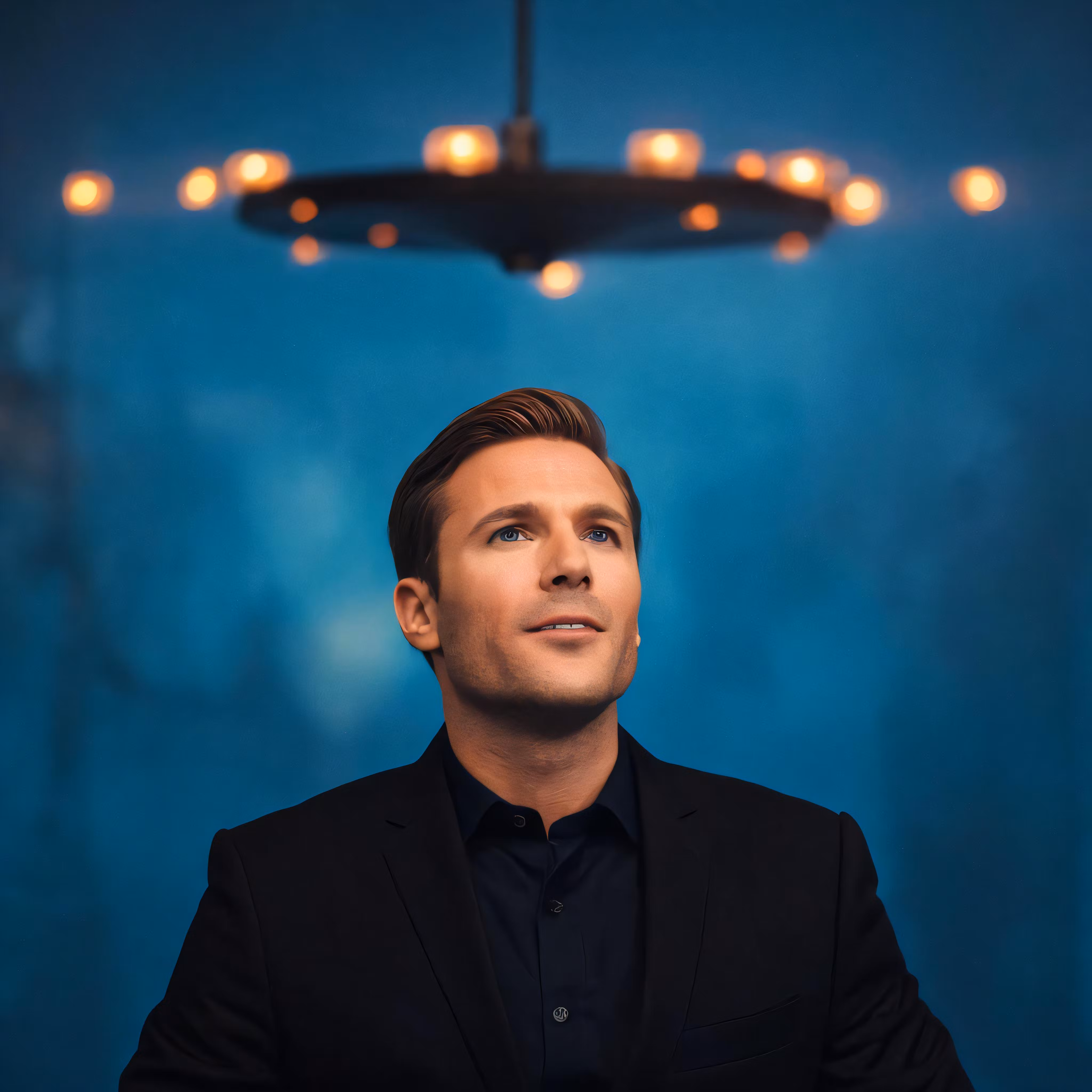 High resolution picture, free to use, a man in black shirt and suit and lights over head