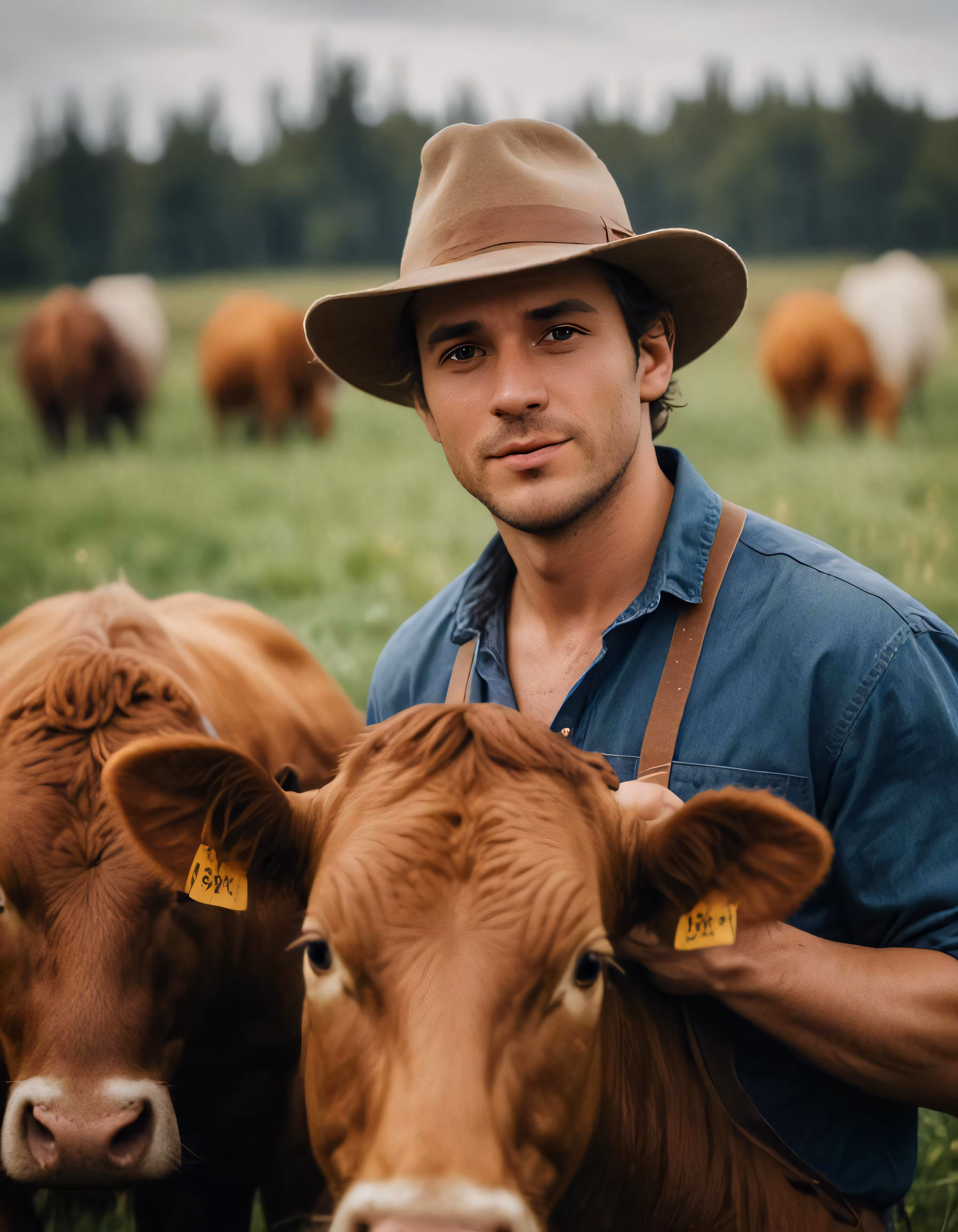 High resolution picture, free to use, a man in brown hat leaning on cows