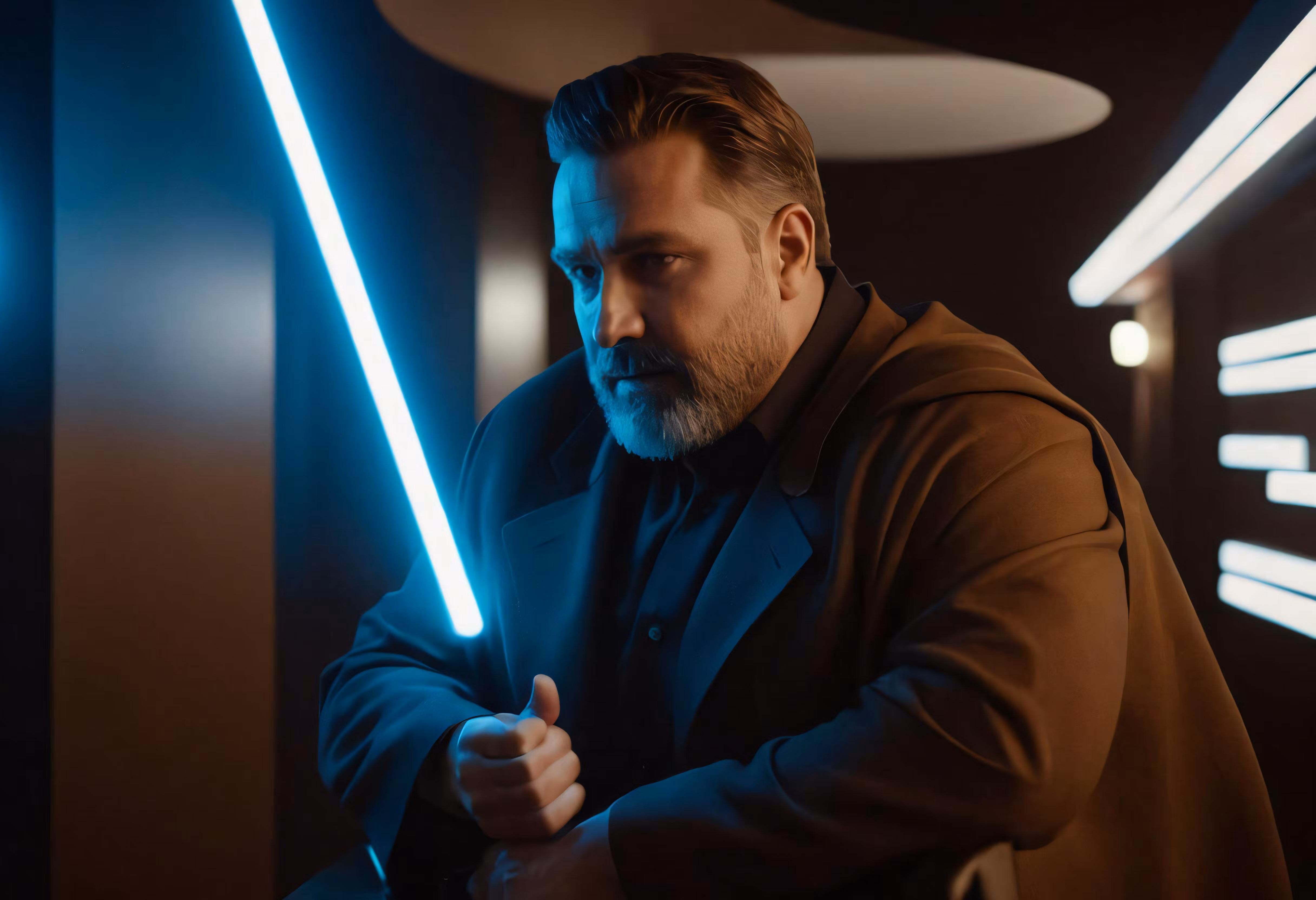 High resolution picture, free to use, a man in dark robes holds a glowing light saber