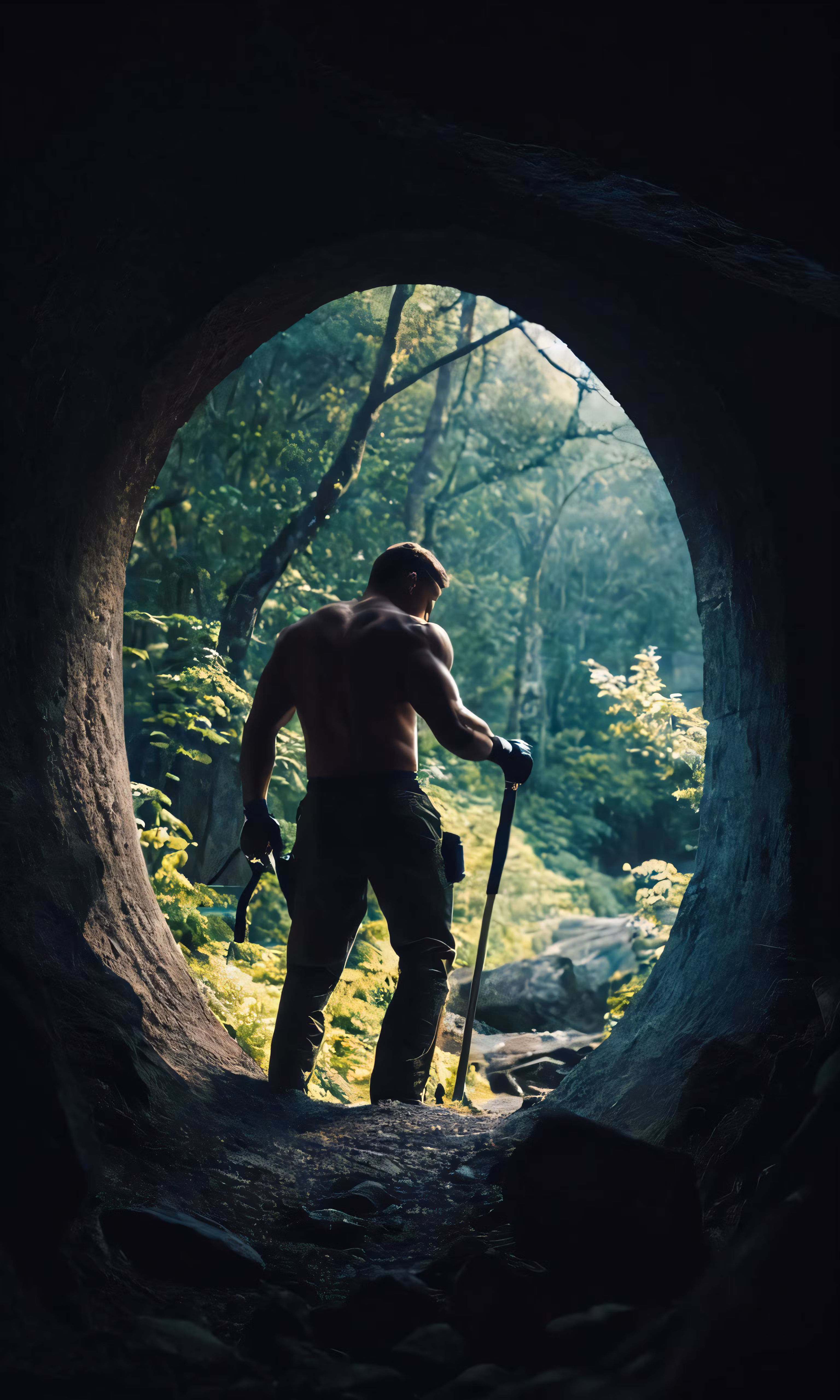 High resolution picture, free to use, a man in full body with poles standing in a cave