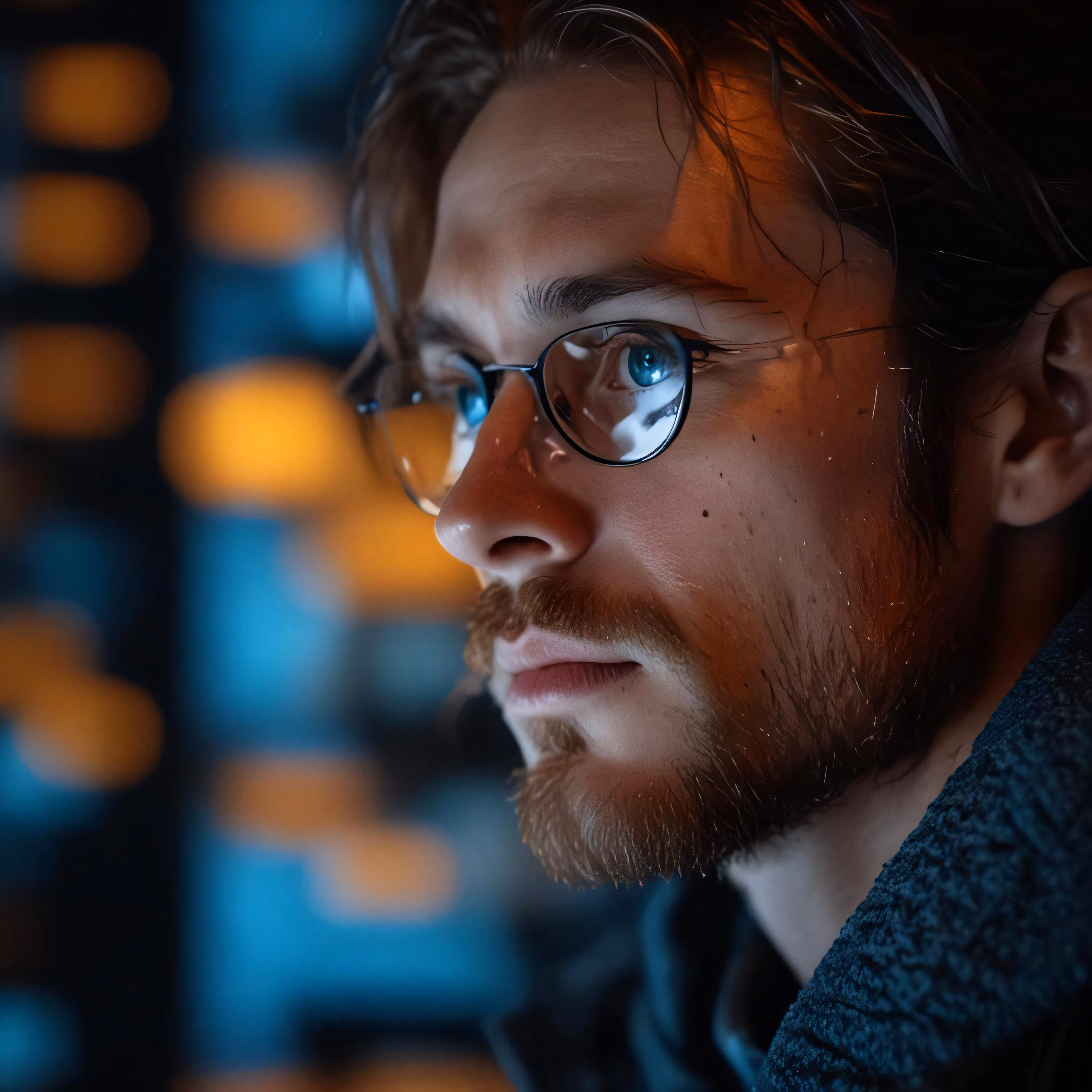 High resolution picture, free to use, a man in glasses stares intently away from the camera