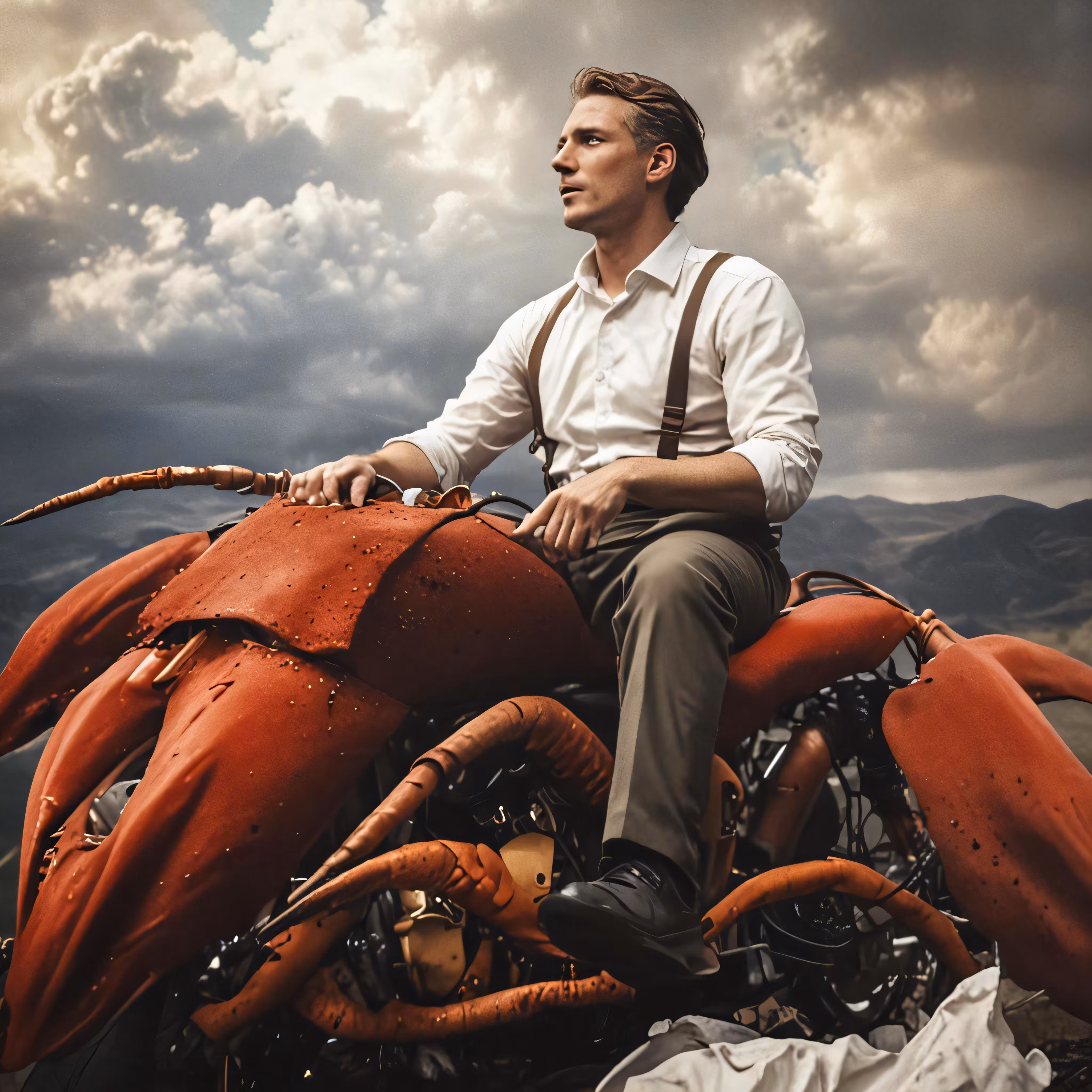 High resolution picture, free to use, a man in suspenders sits on an orange object