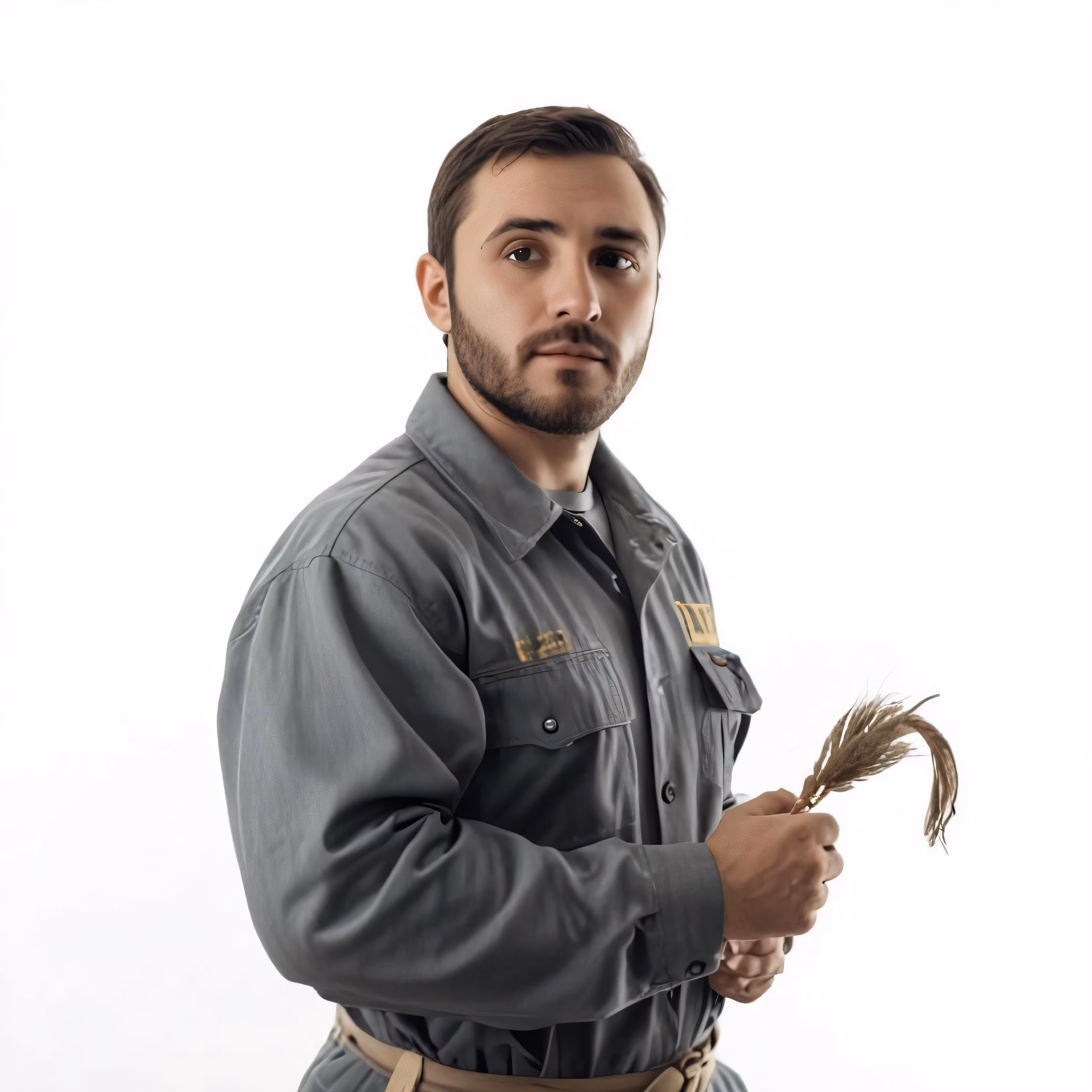 High resolution picture, free to use, a man in uniform holding a feather and looking at the camera