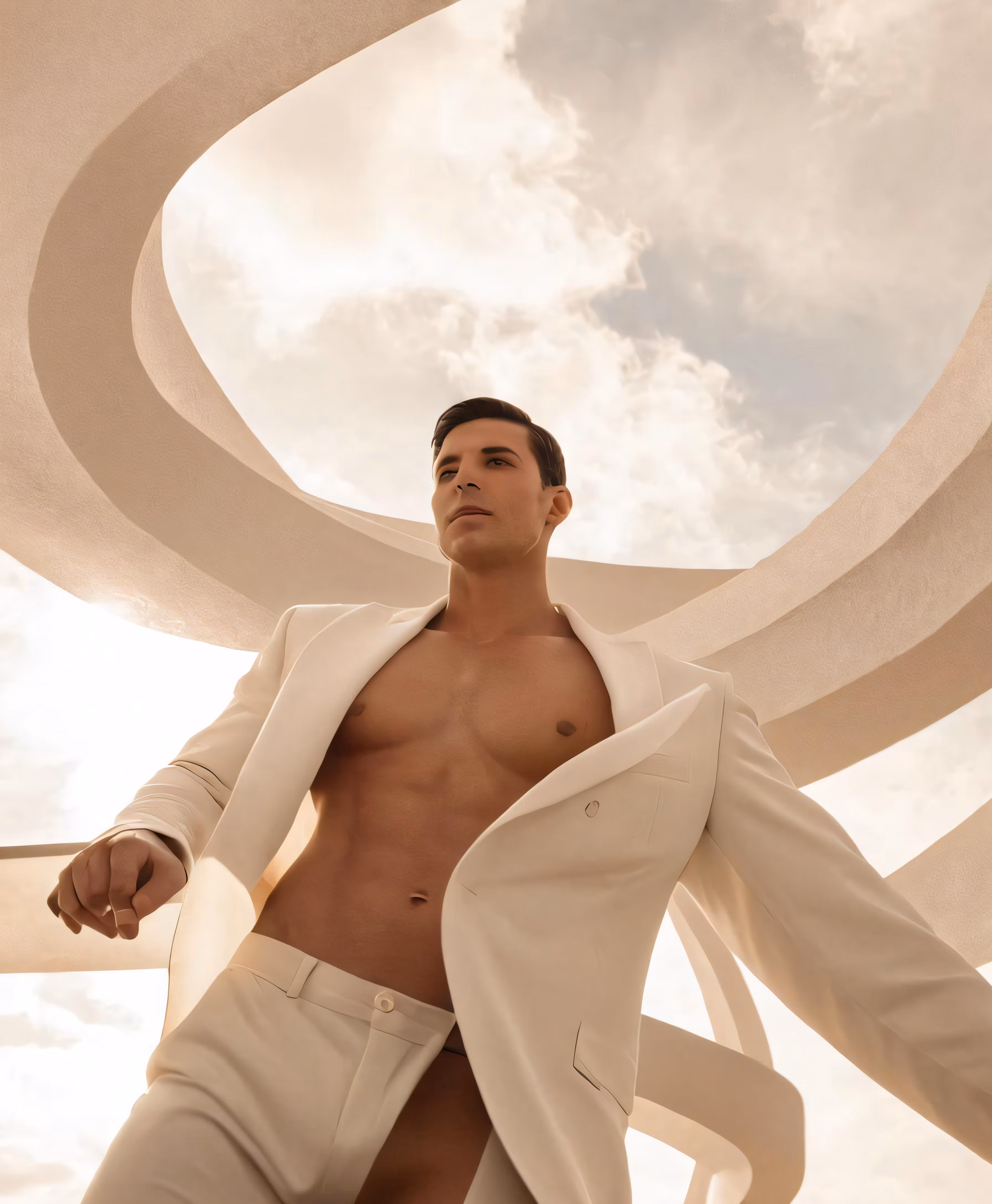 High resolution picture, free to use, a man in white clothes with his shirt open