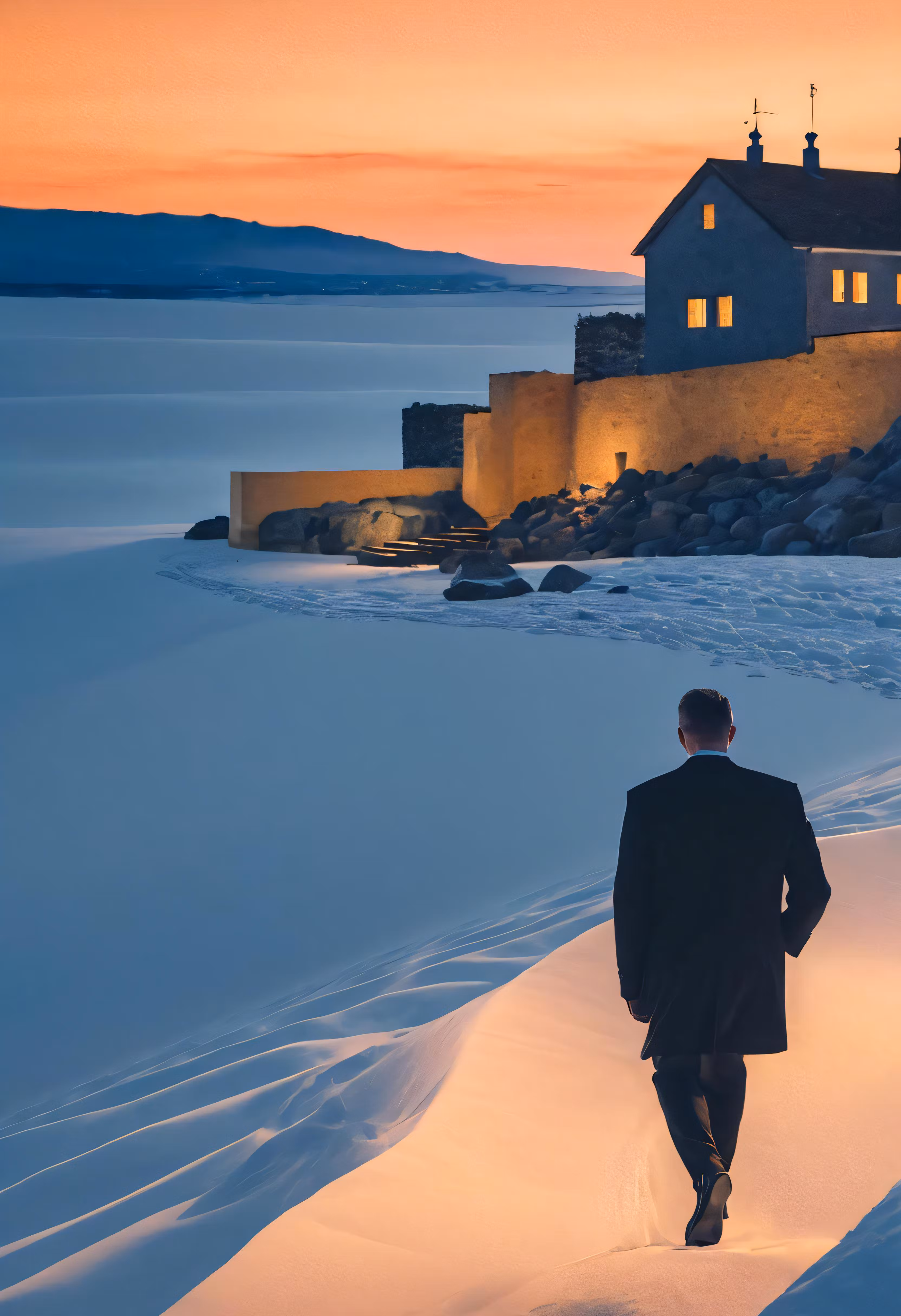 High resolution picture, free to use, a man in winter clothes walking across snow covered ground towards house