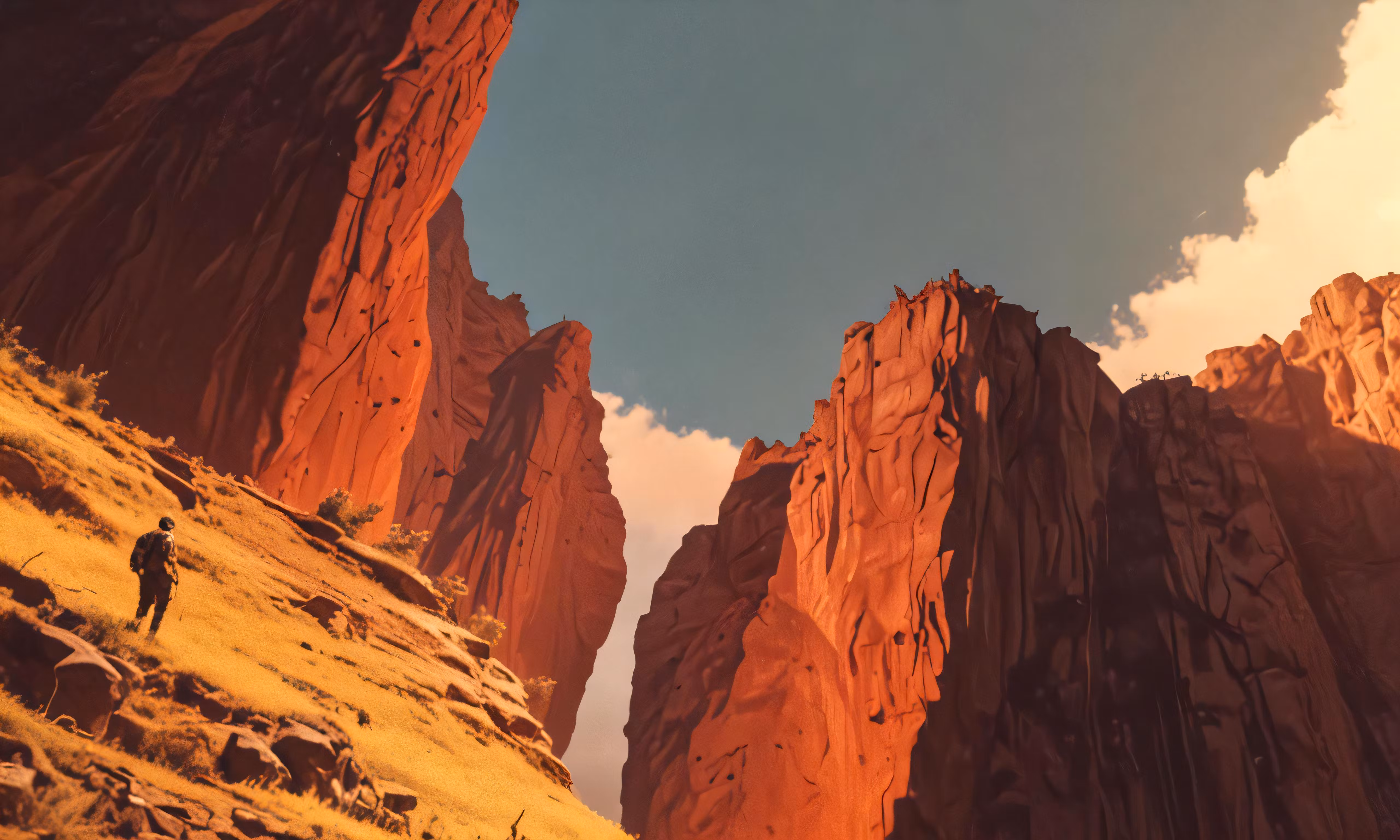 High resolution picture, free to use, a man is hiking amongst mountains under a blue sky