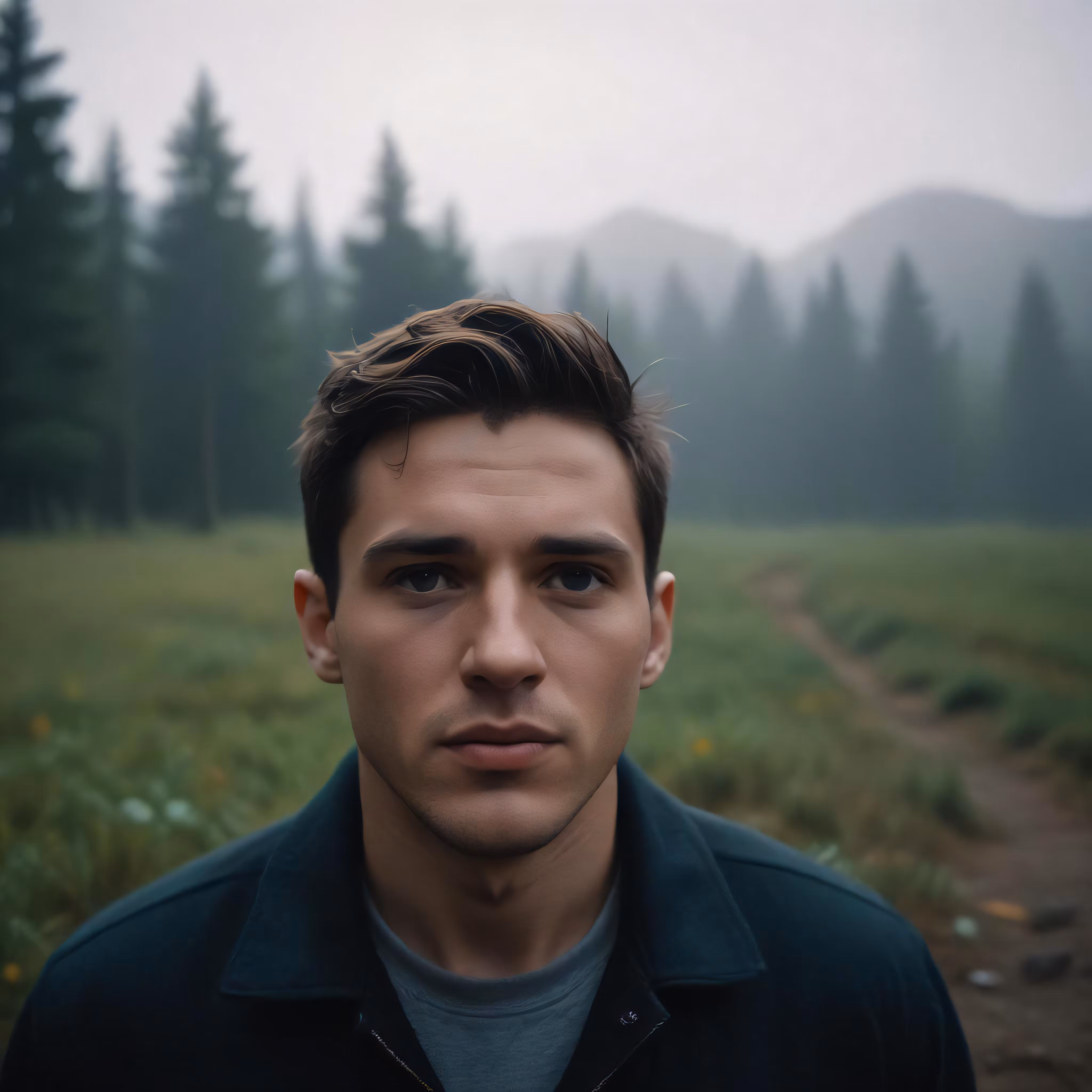 High resolution picture, free to use, a man is in a foggy meadow looking at the camera