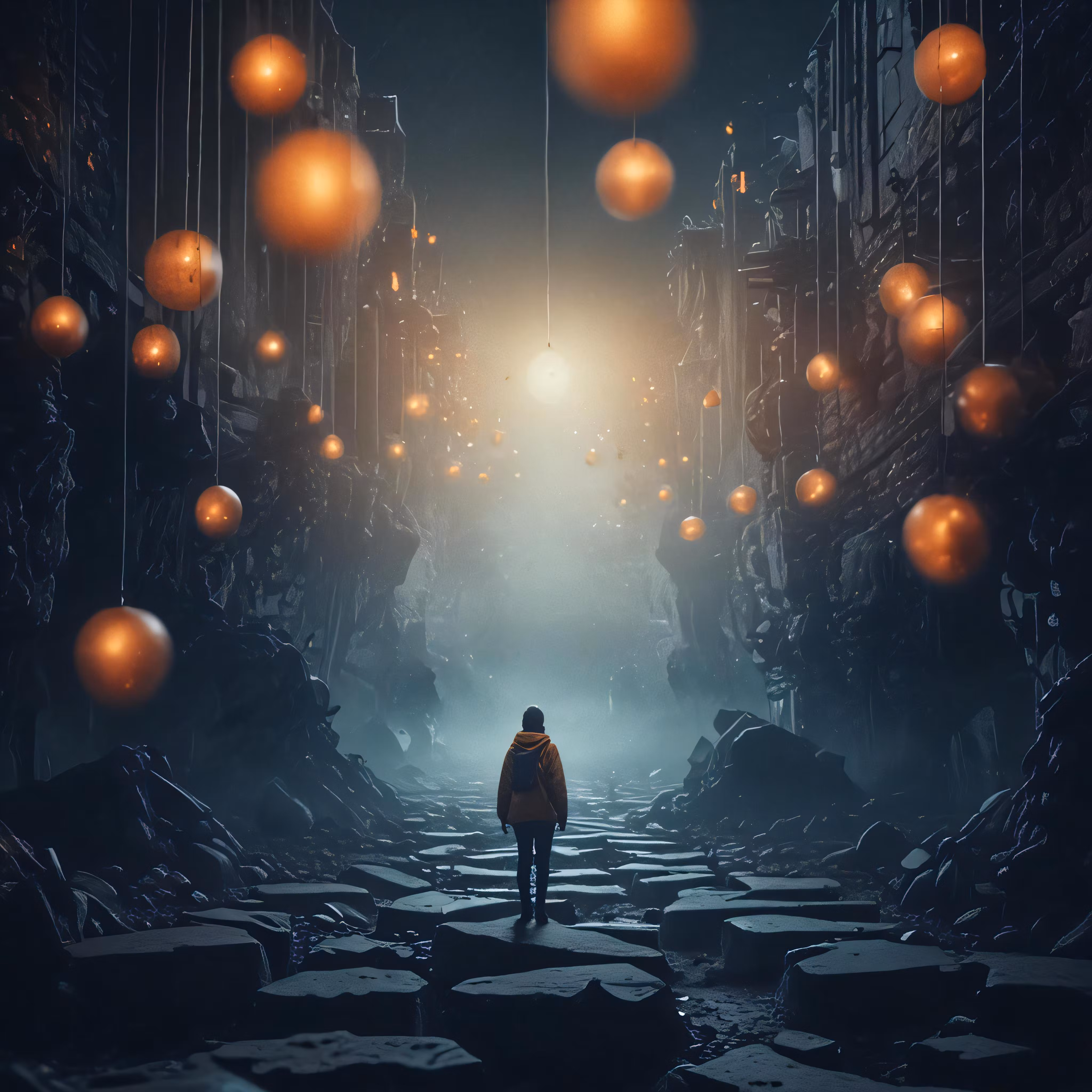 High resolution picture, free to use, a man is looking down an alley covered in lots of lanterns