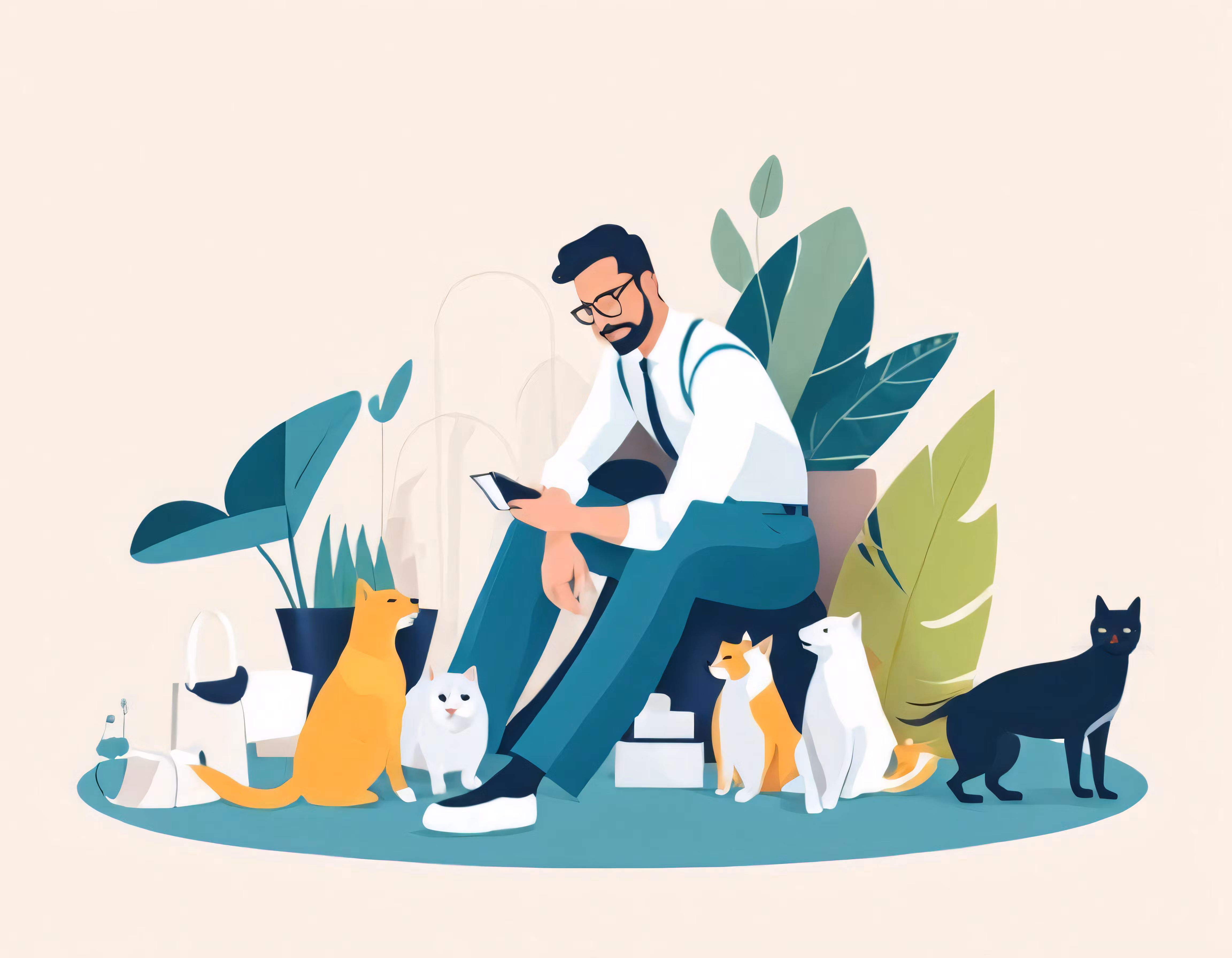High resolution picture, free to use, a man is sitting on a bench surrounded by cats and plants