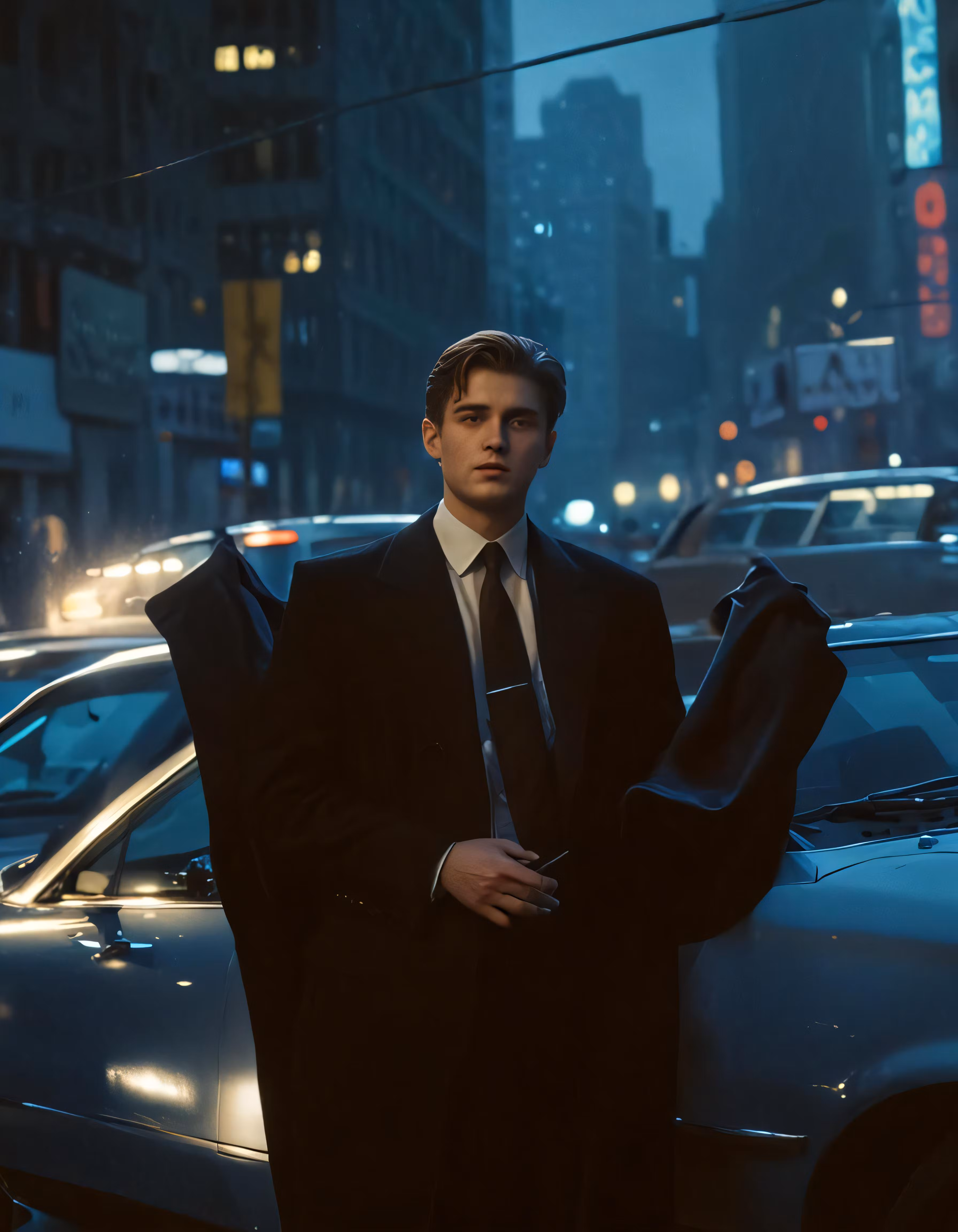 High resolution picture, free to use, a man is standing near some cars in the rain