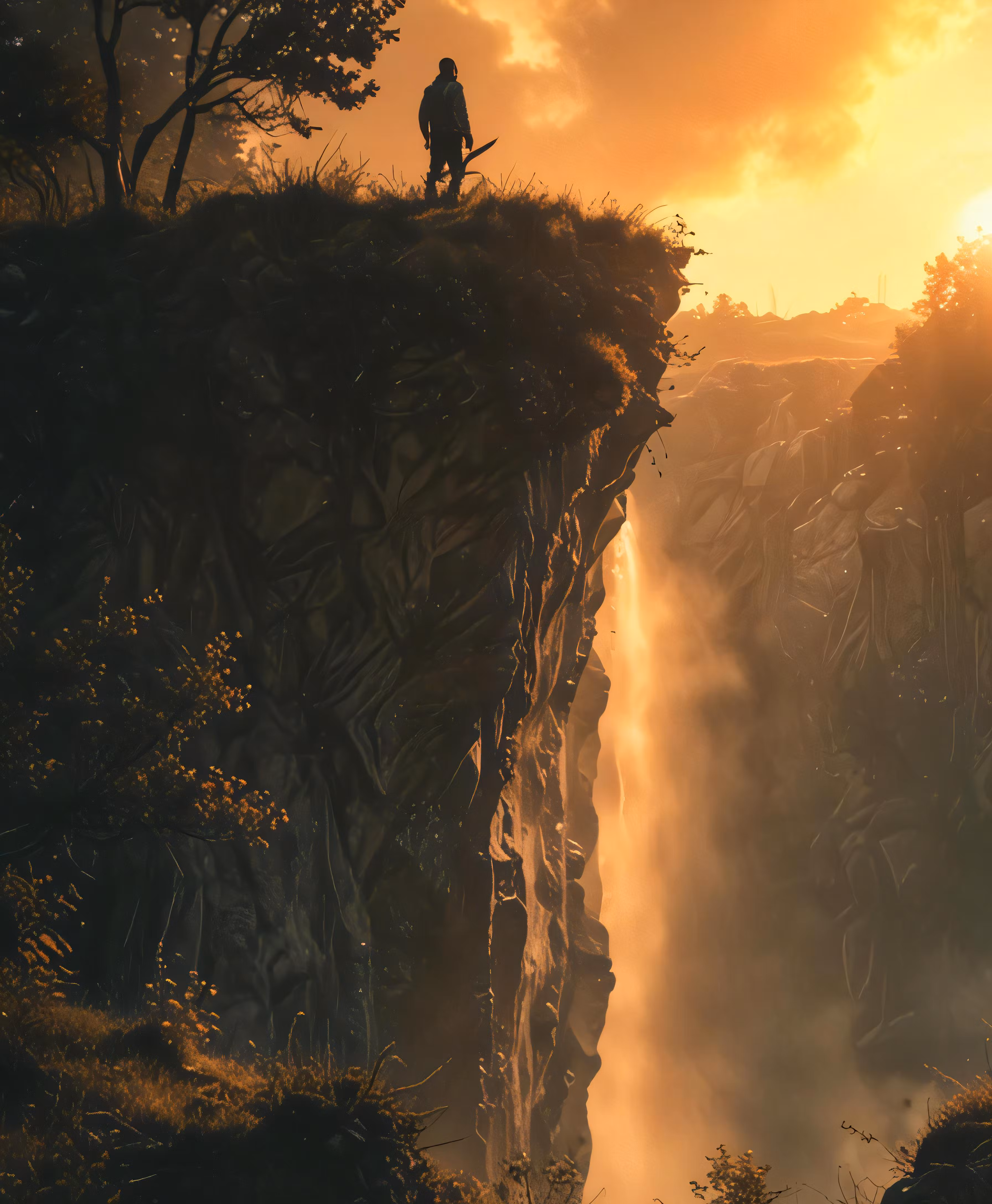 High resolution picture, free to use, a man is standing on a hill above a waterfall