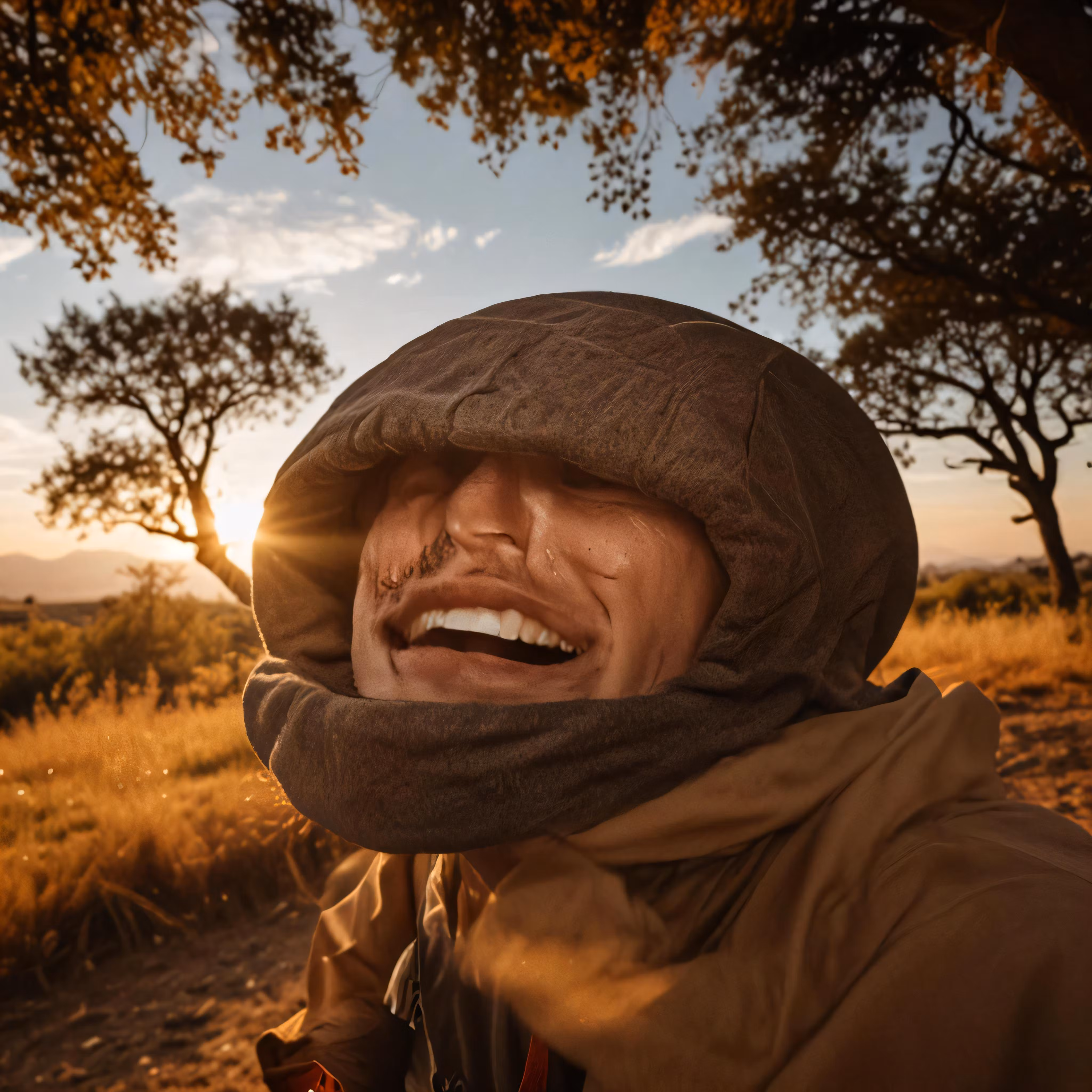 High resolution picture, free to use, a man is standing with a hood on in front of trees