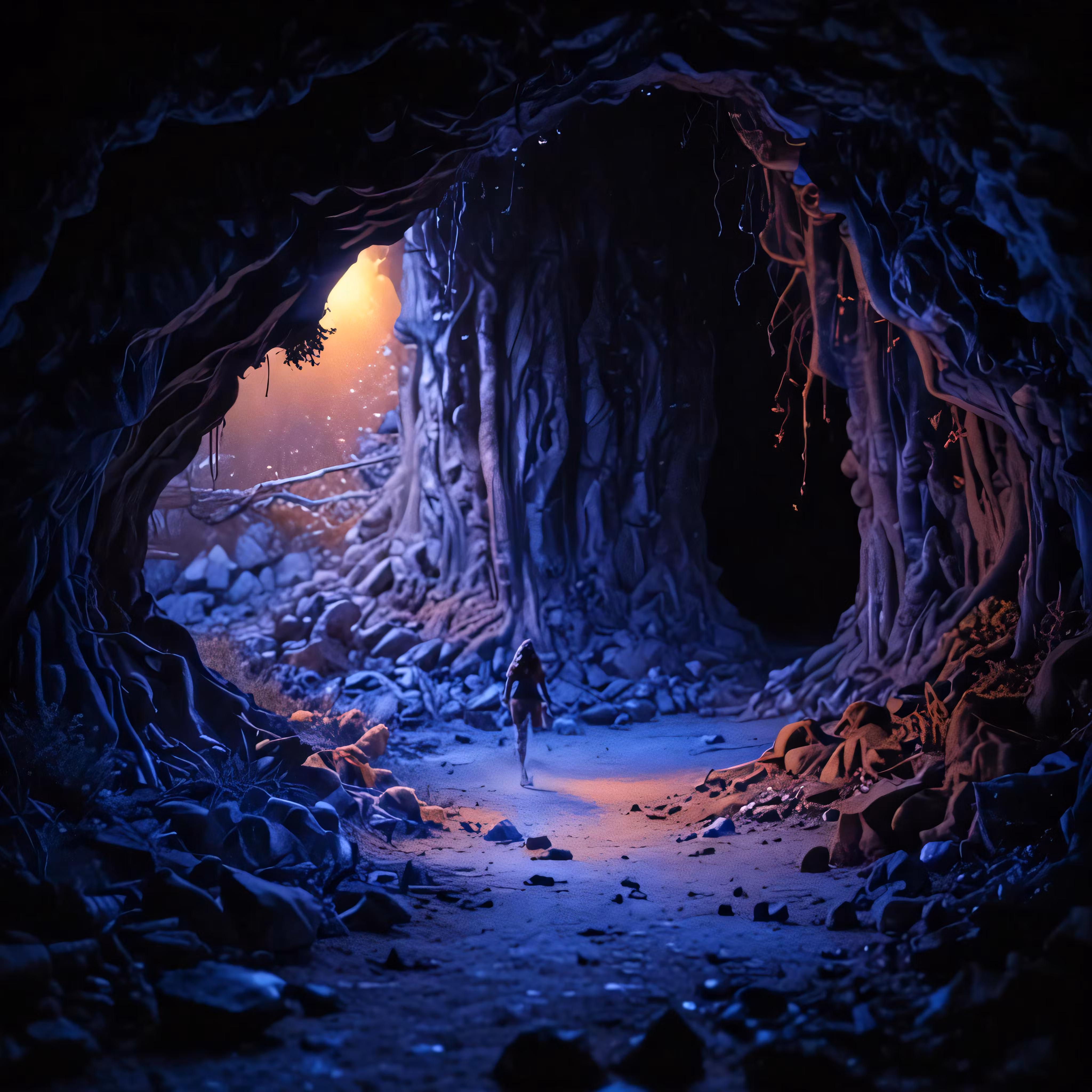 High resolution picture, free to use, a man is walking into a cave with no one in it
