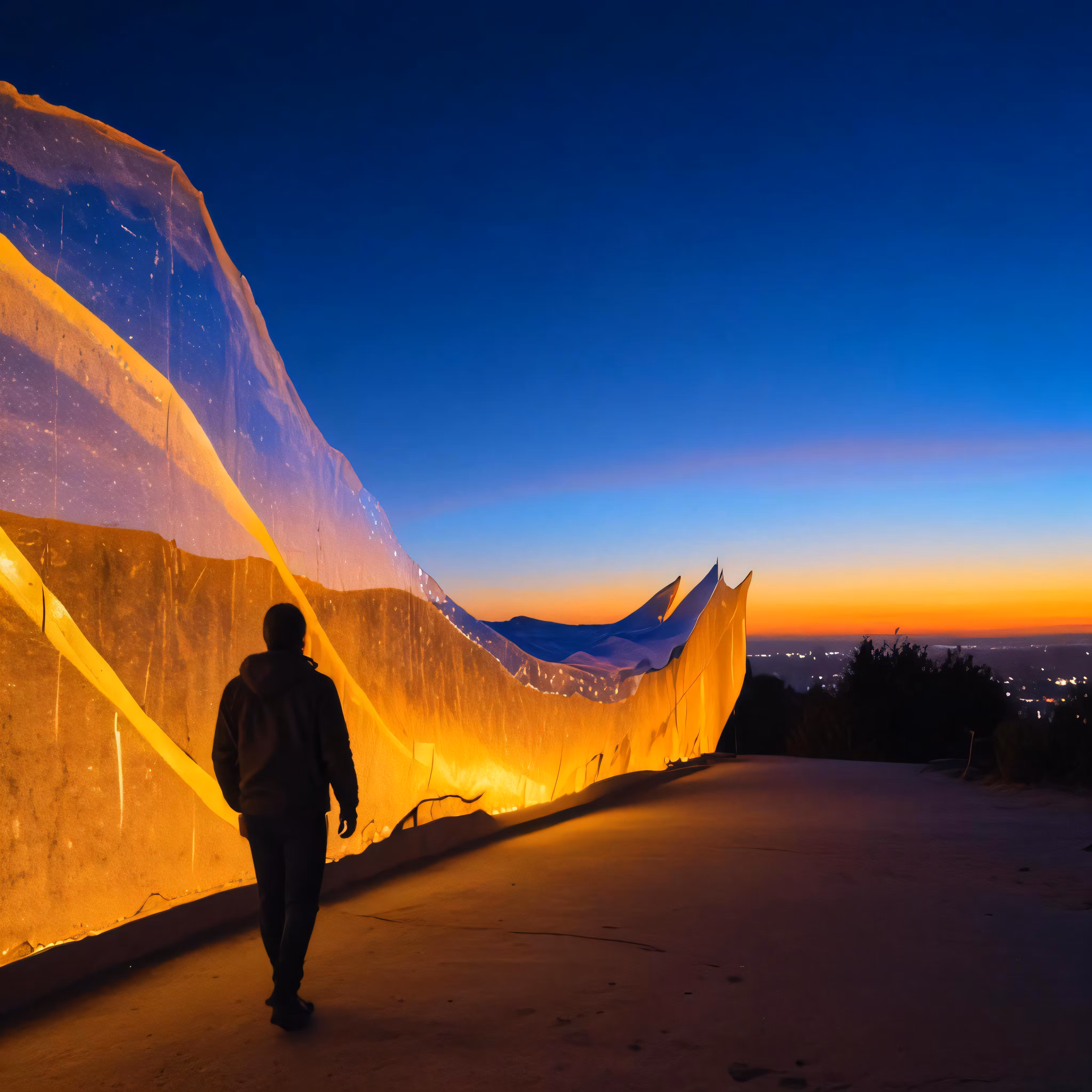 High resolution picture, free to use, a man is walking past a huge wall that is lit up