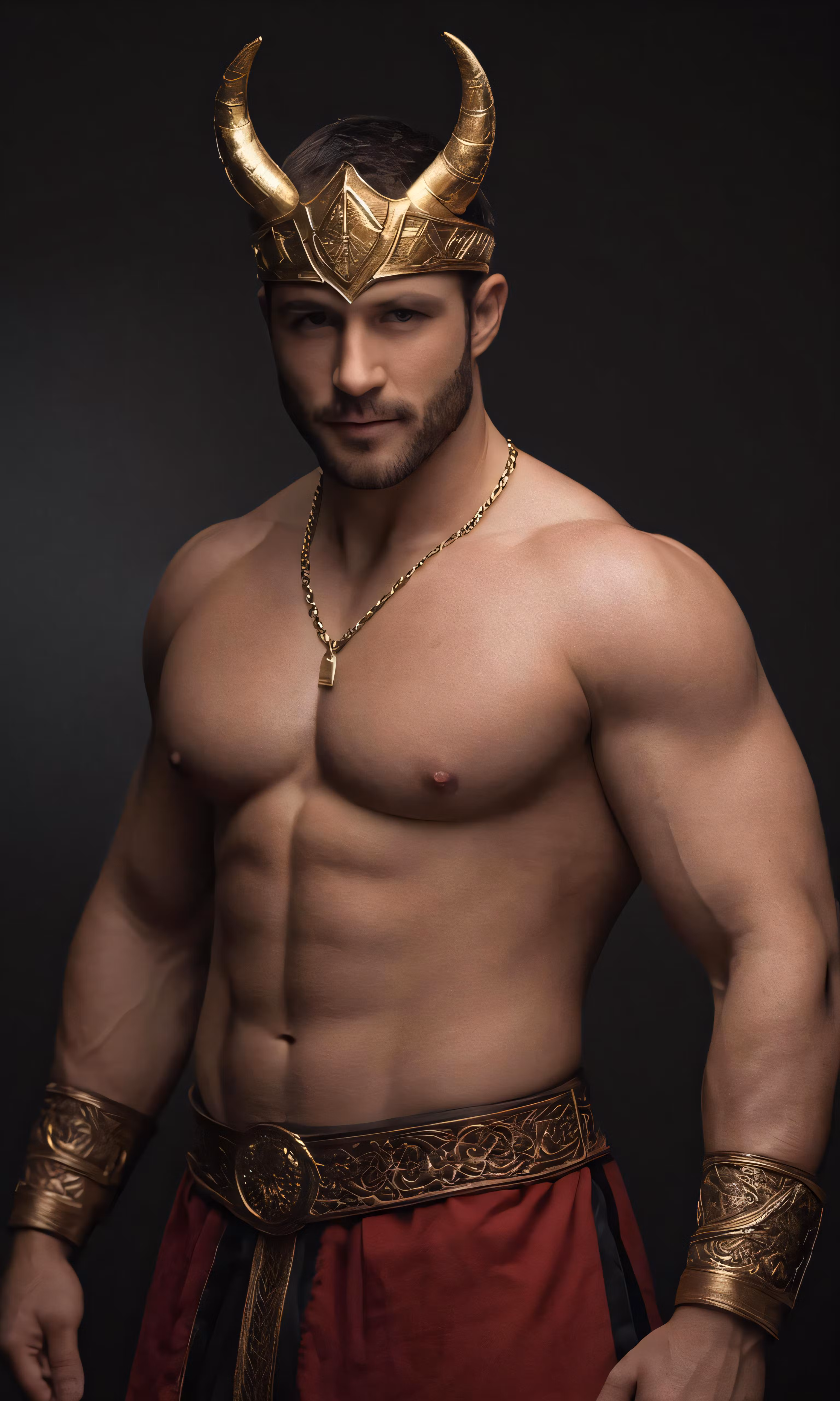 High resolution picture, free to use, a man is wearing horned gold headgear, and posing for a picture