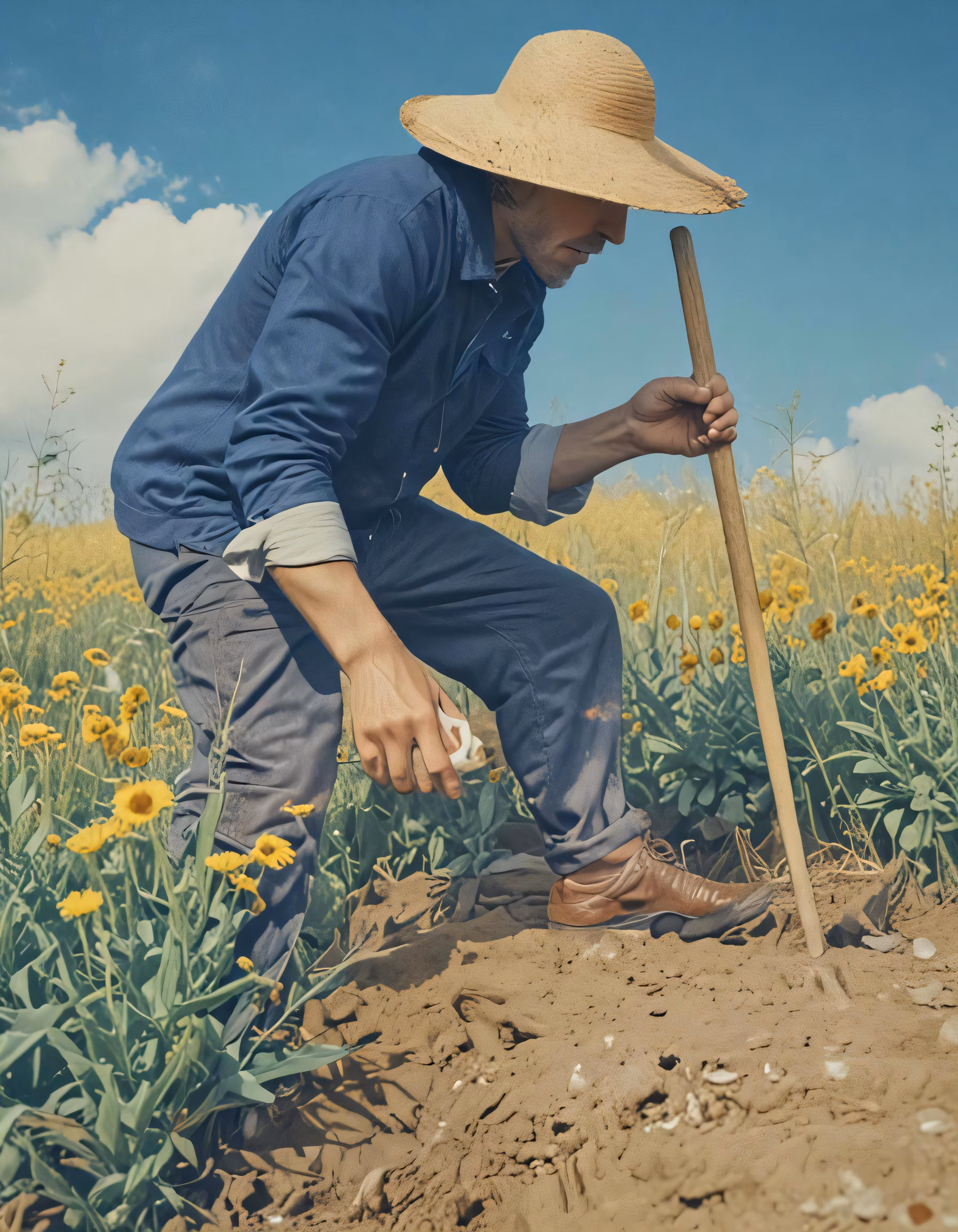 High resolution picture, free to use, a man kneeling down holding a long stick and digging in the ground