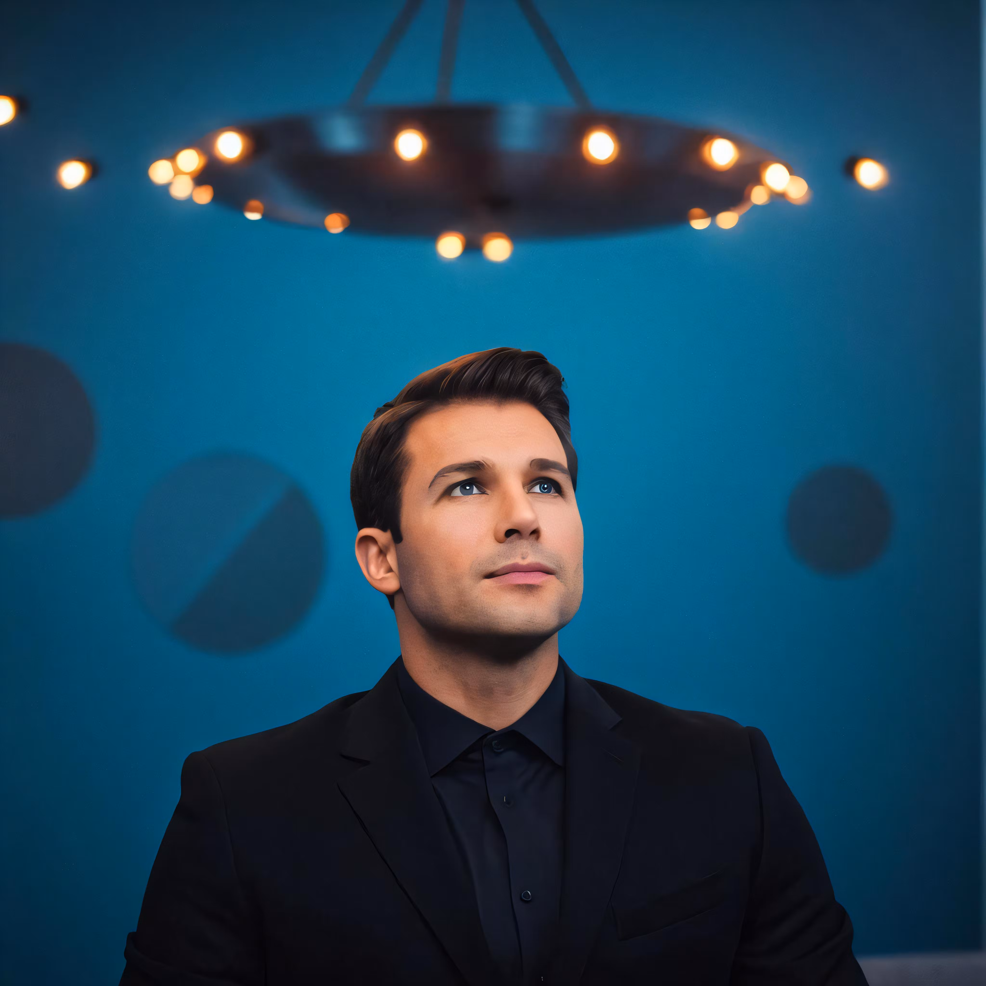 High resolution picture, free to use, a man looking up while wearing a black shirt and jacket