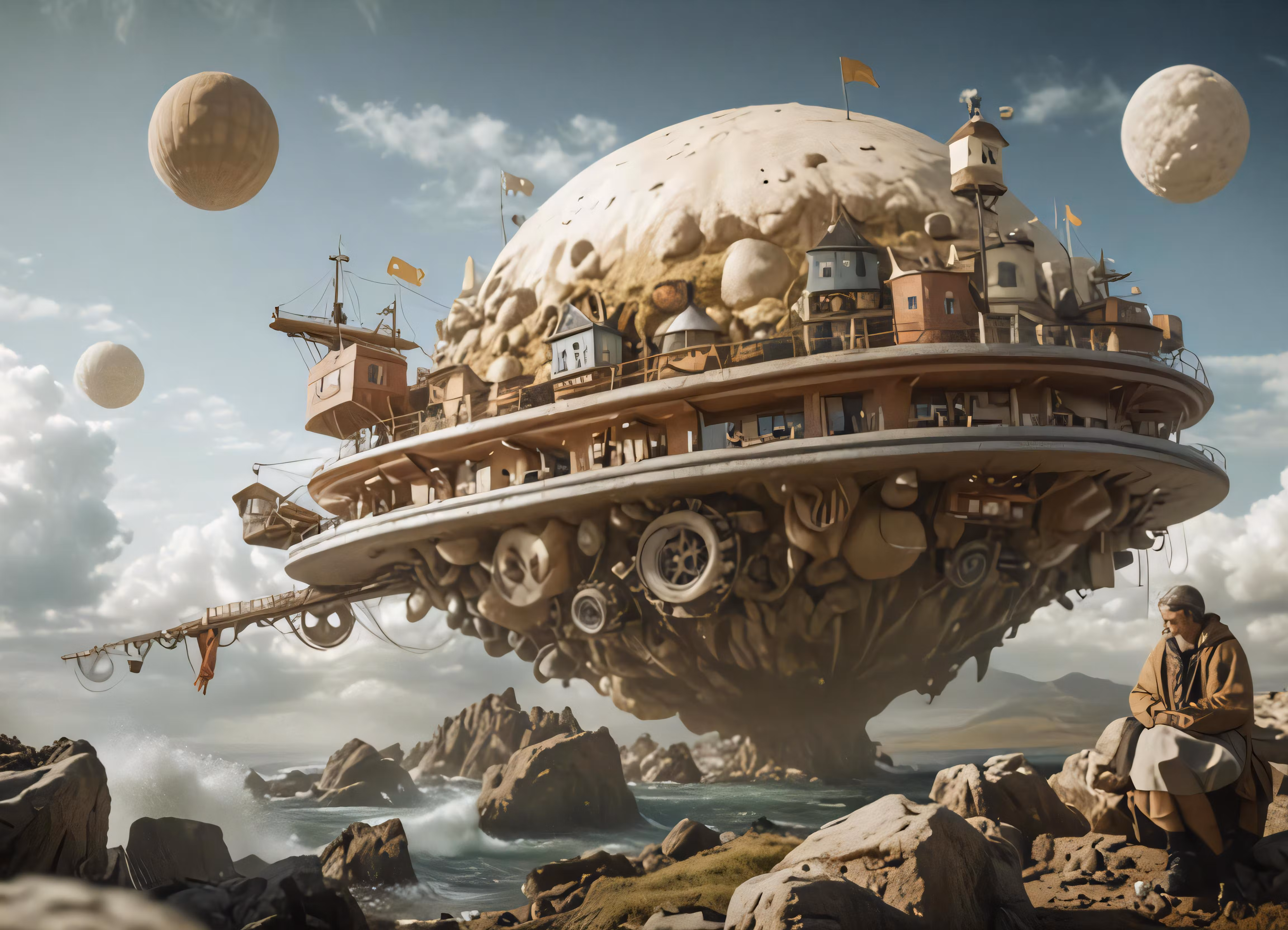 High resolution picture, free to use, a man looks at an enormous, surreally designed building on a rocky cliff
