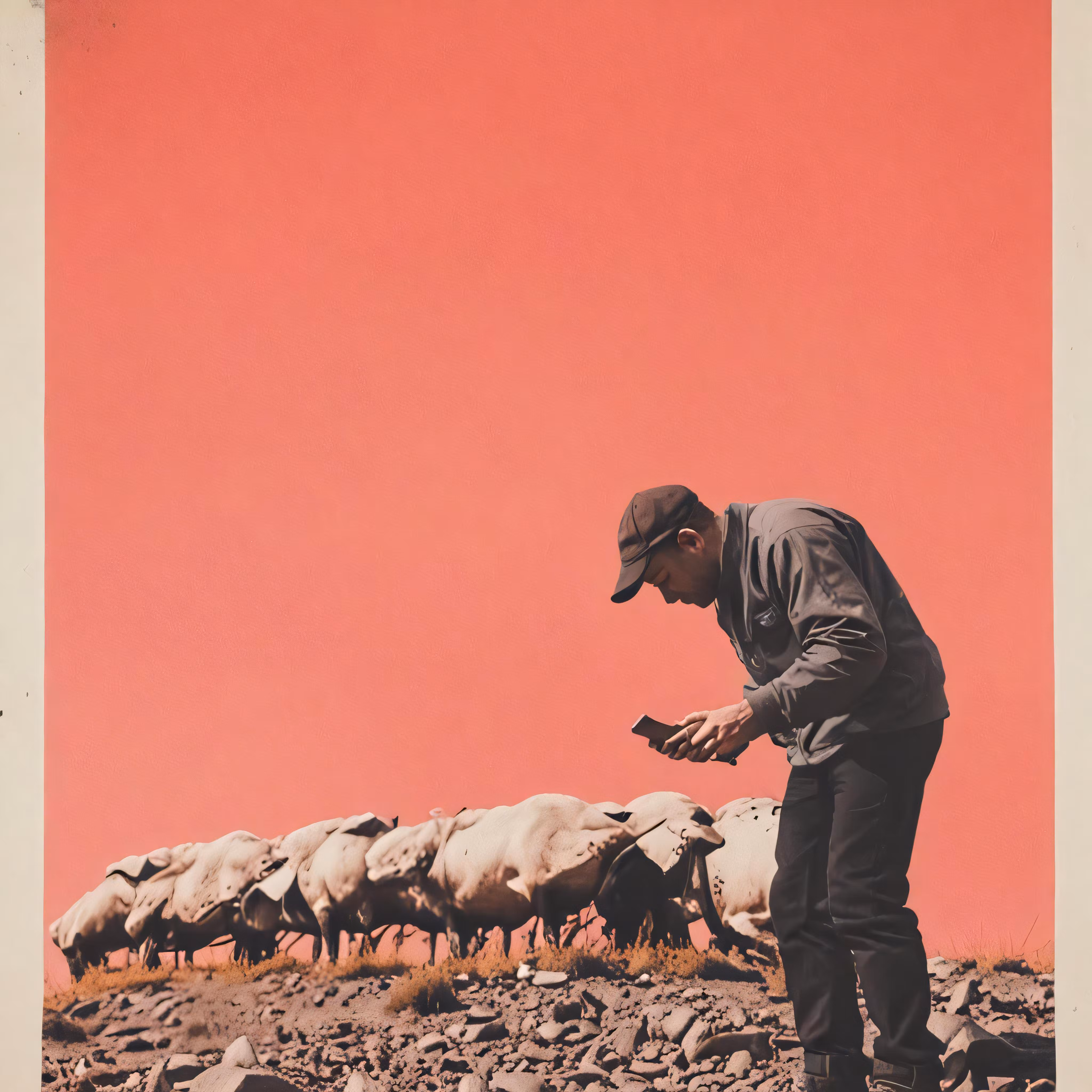 High resolution picture, free to use, a man on a field with sheep and a red wall