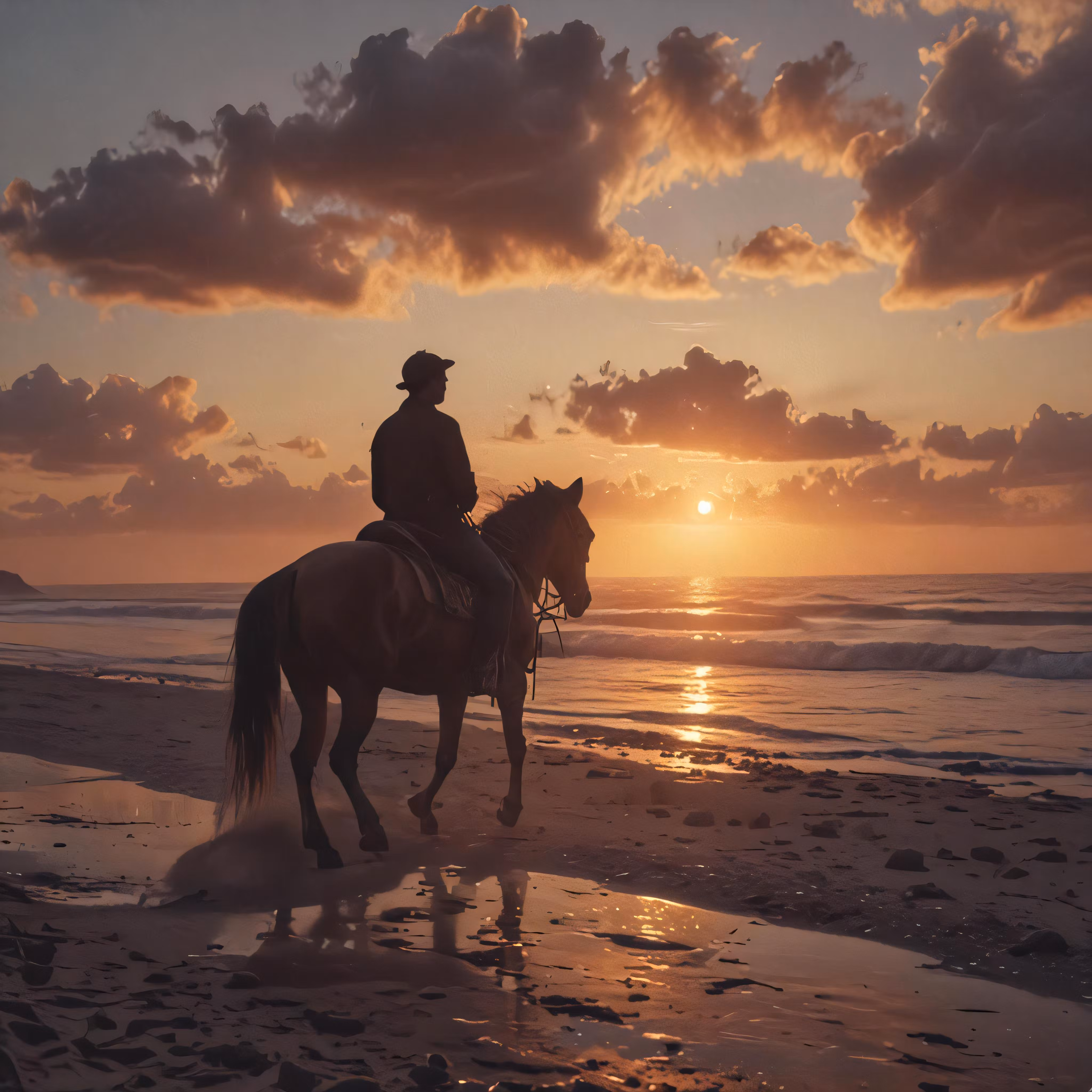 High resolution picture, free to use, a man on horseback and sunset at beach with dog