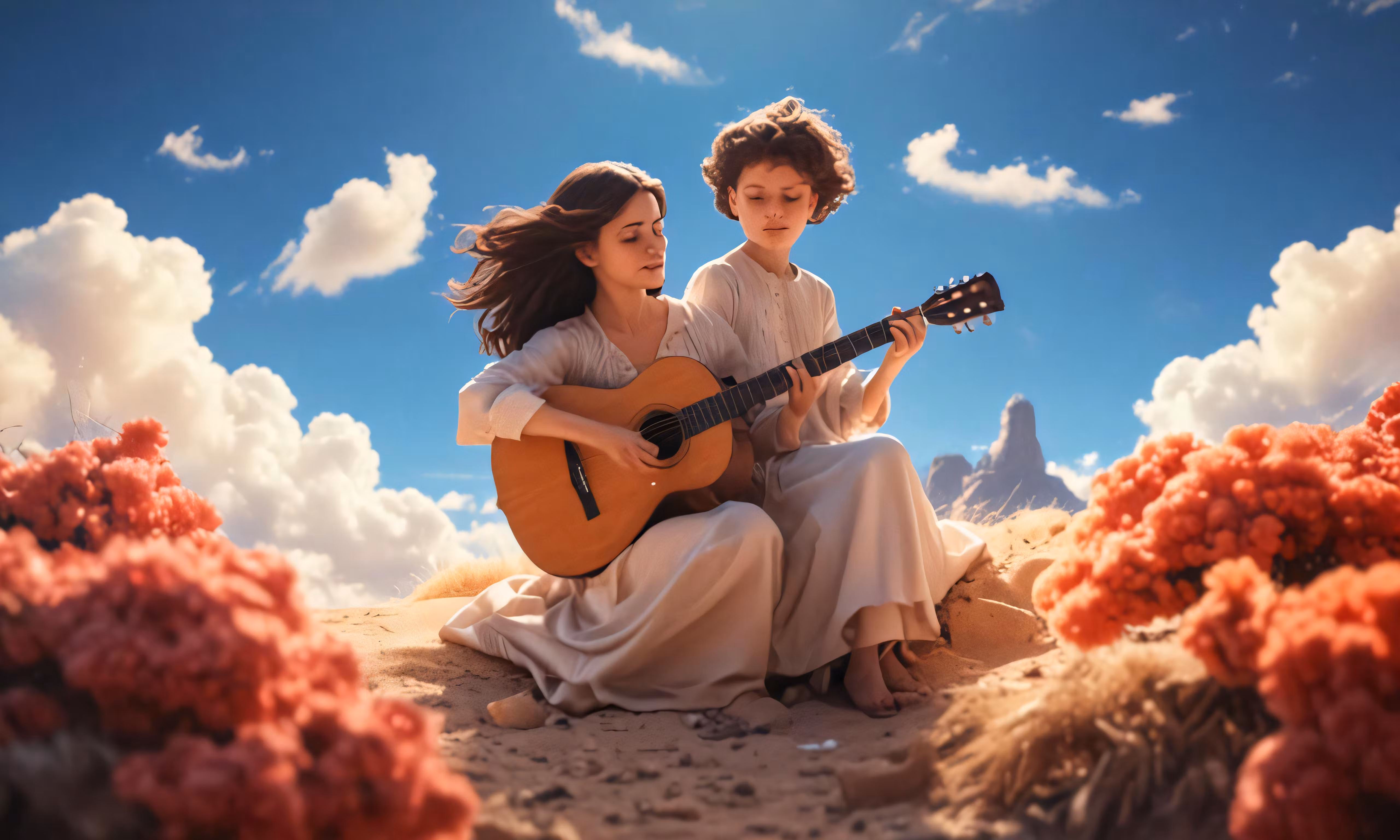 High resolution picture, free to use, a man playing guitar next to a woman on a beach