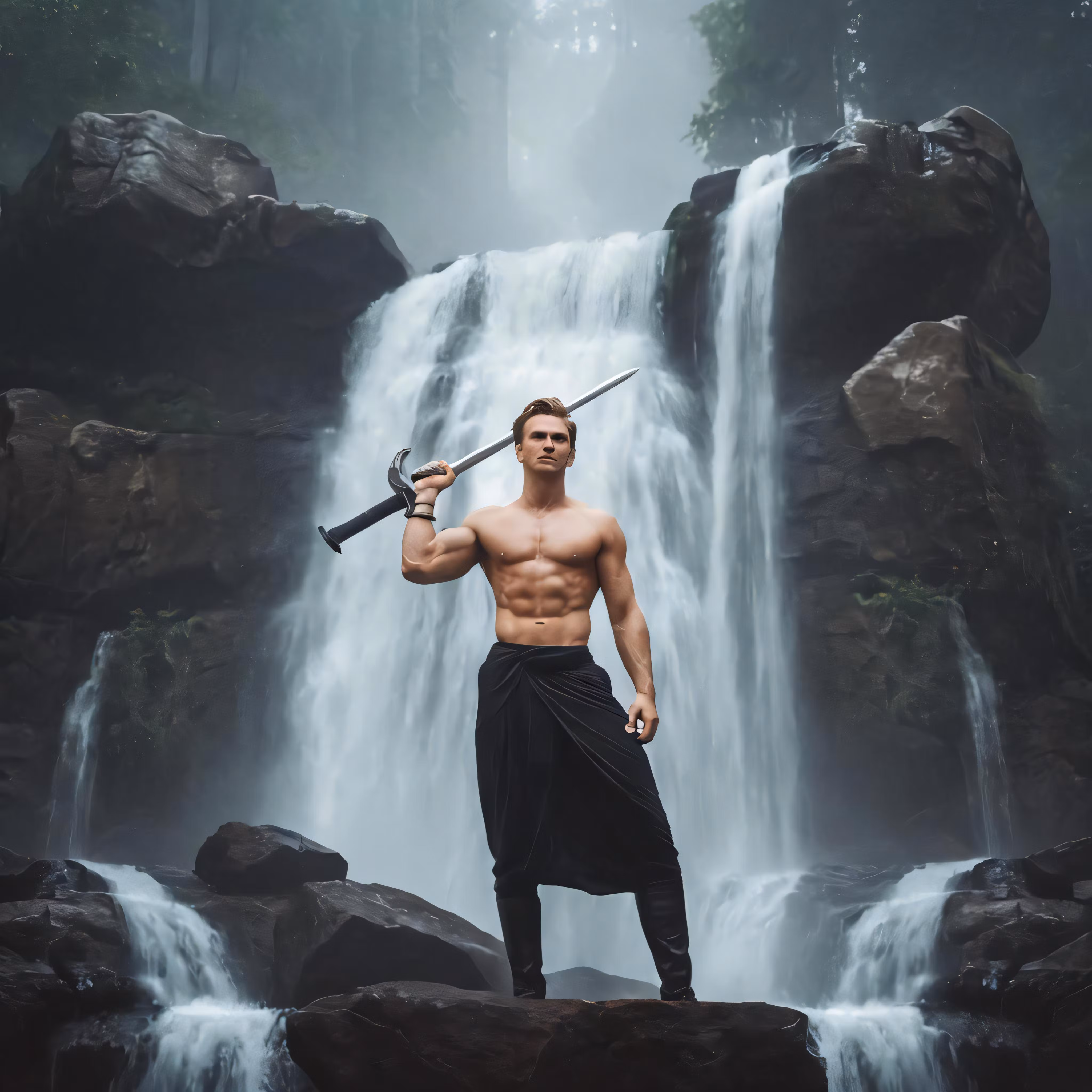 High resolution picture, free to use, a man posing for a photo with a water fall in the background