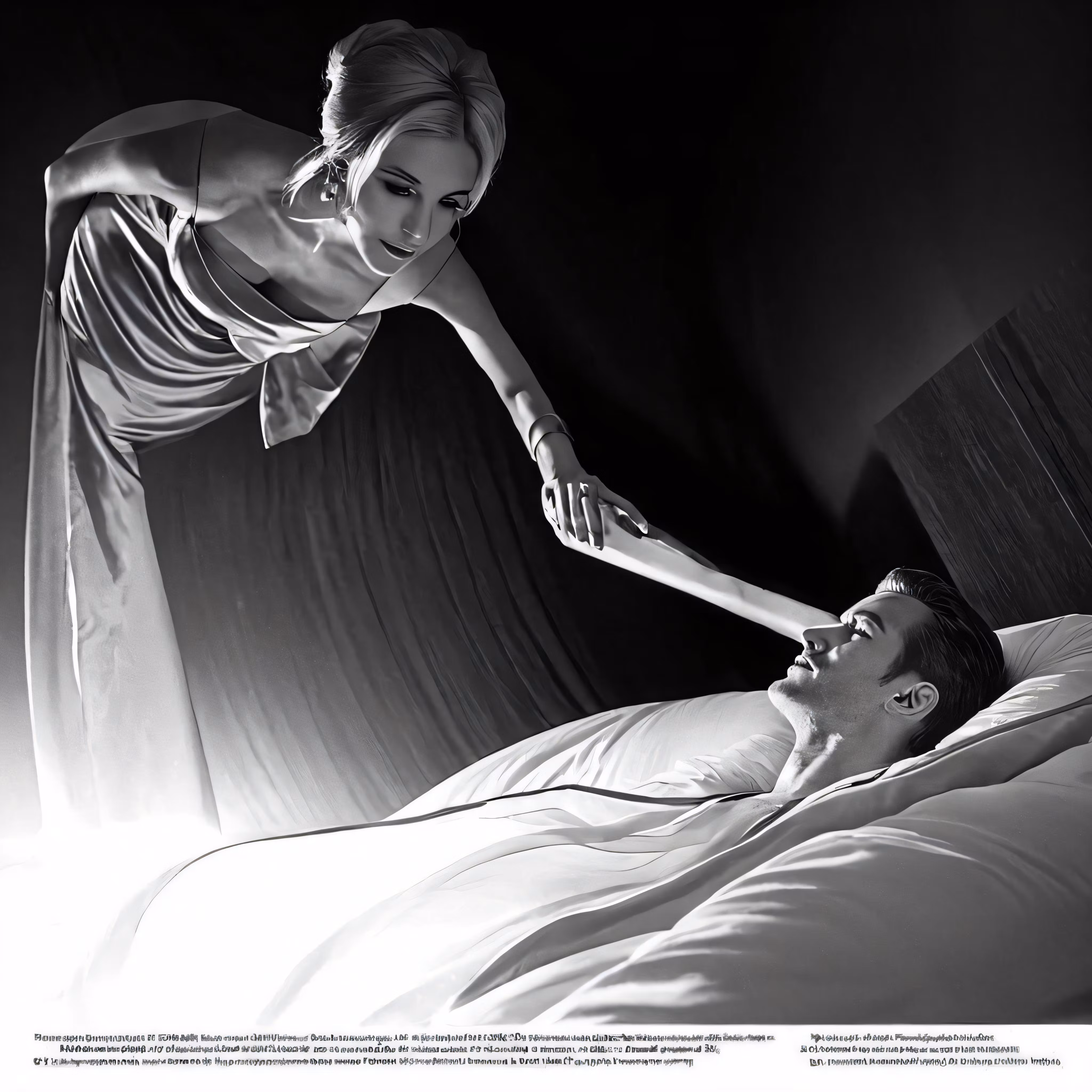 High resolution picture, free to use, a man reaching his head over the edge of a bed to touch the head of a woman
