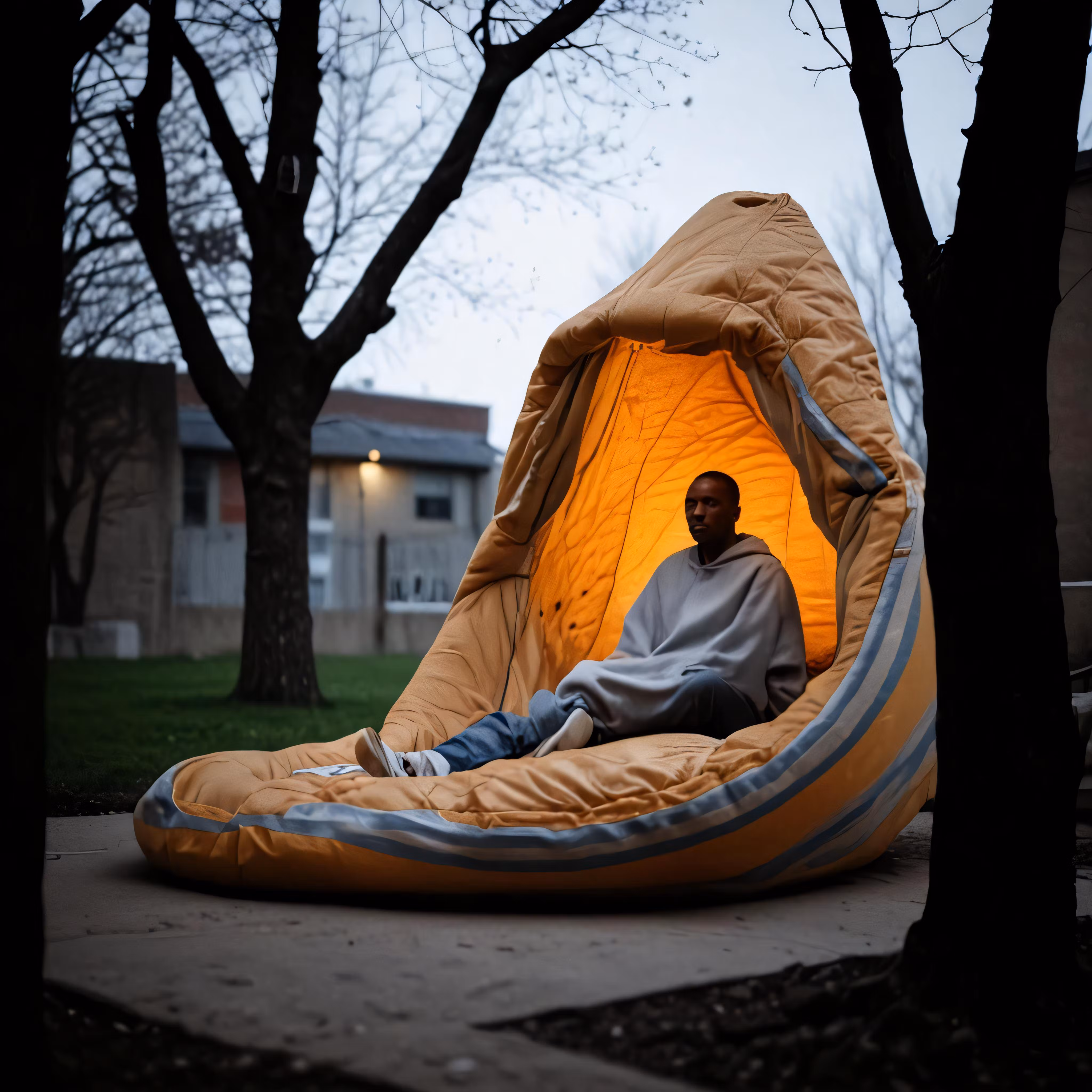 High resolution picture, free to use, a man relaxing in a tent shaped like a rock