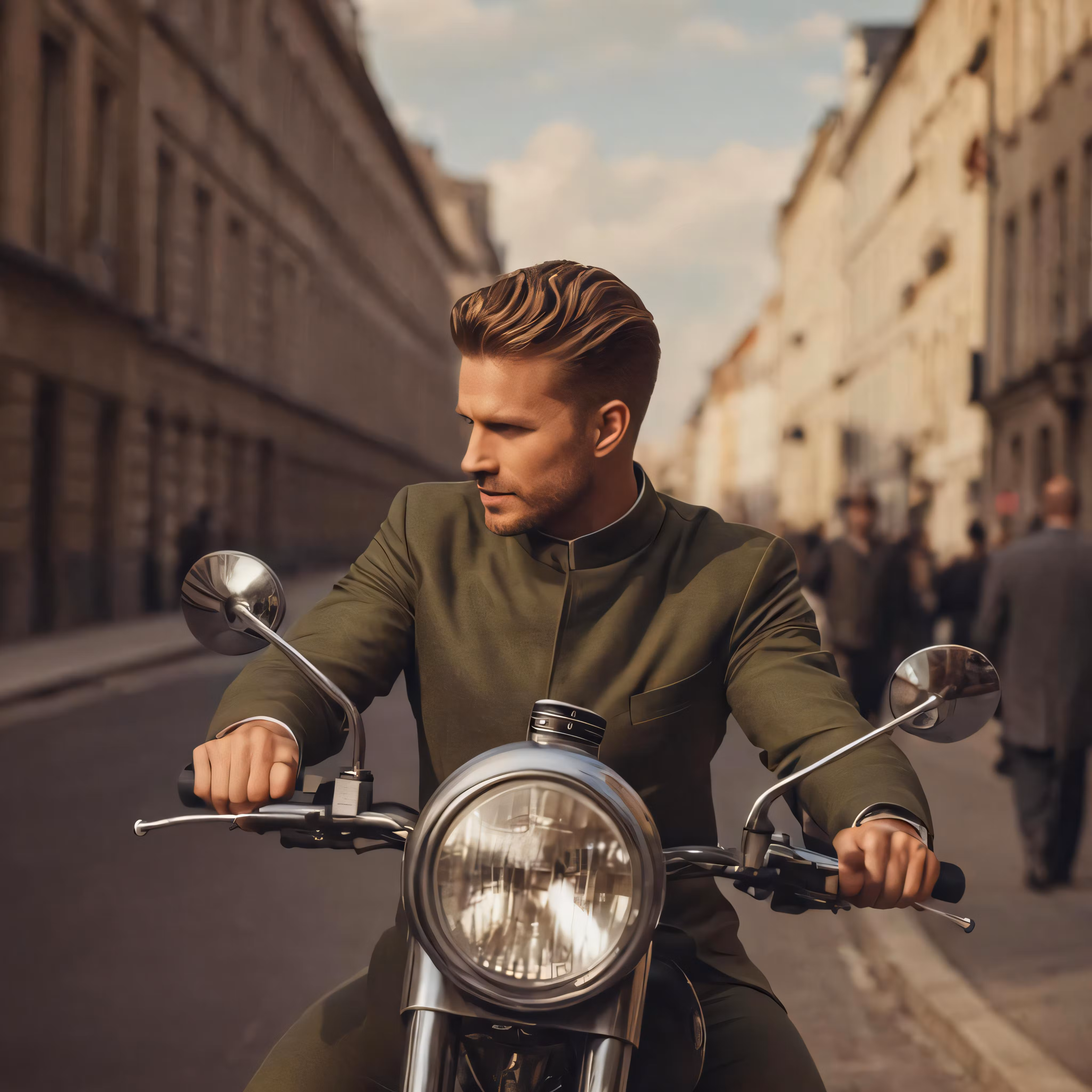 High resolution picture, free to use, a man riding a motorcycle next to other men in front of buildings