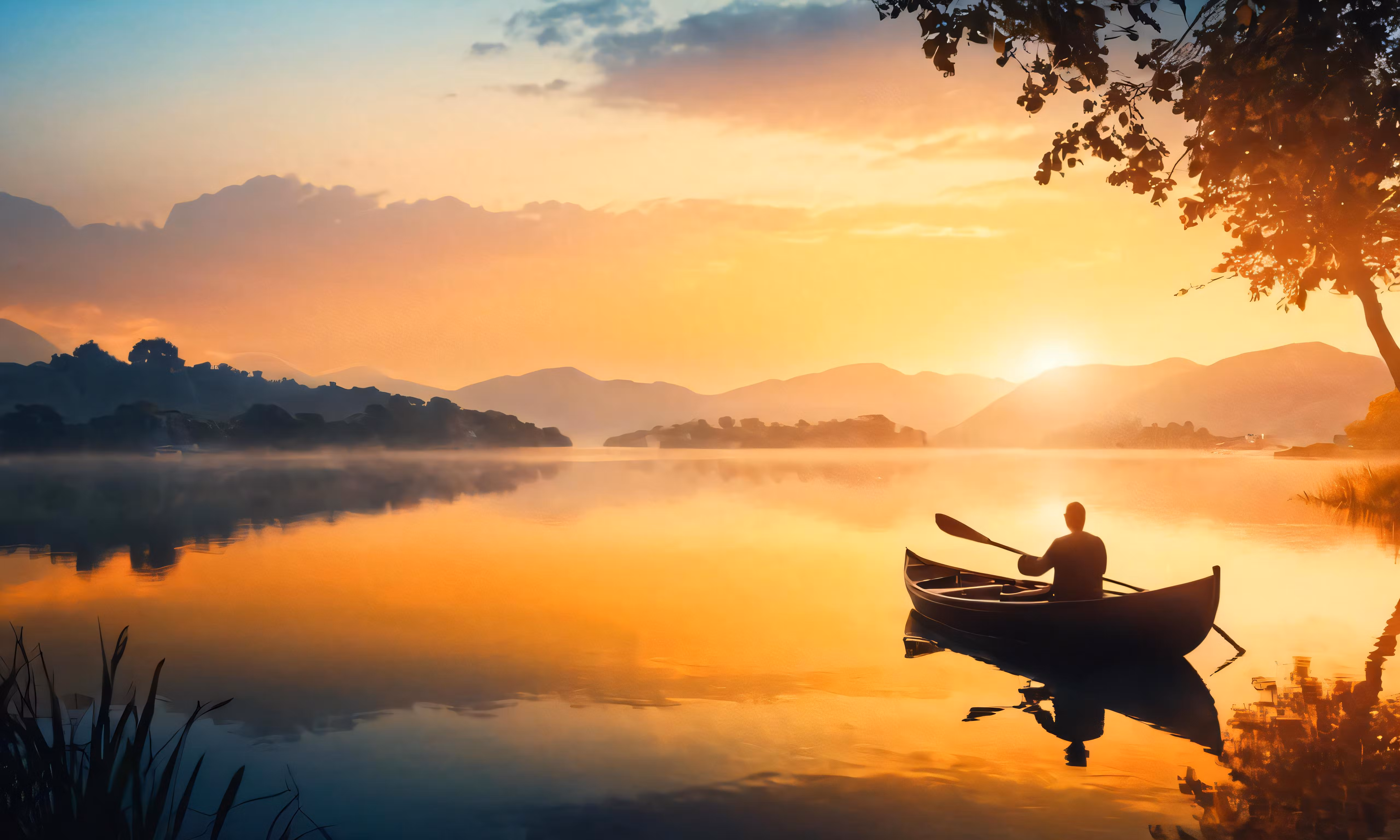 High resolution picture, free to use, a man rows his canoe as the sun sets