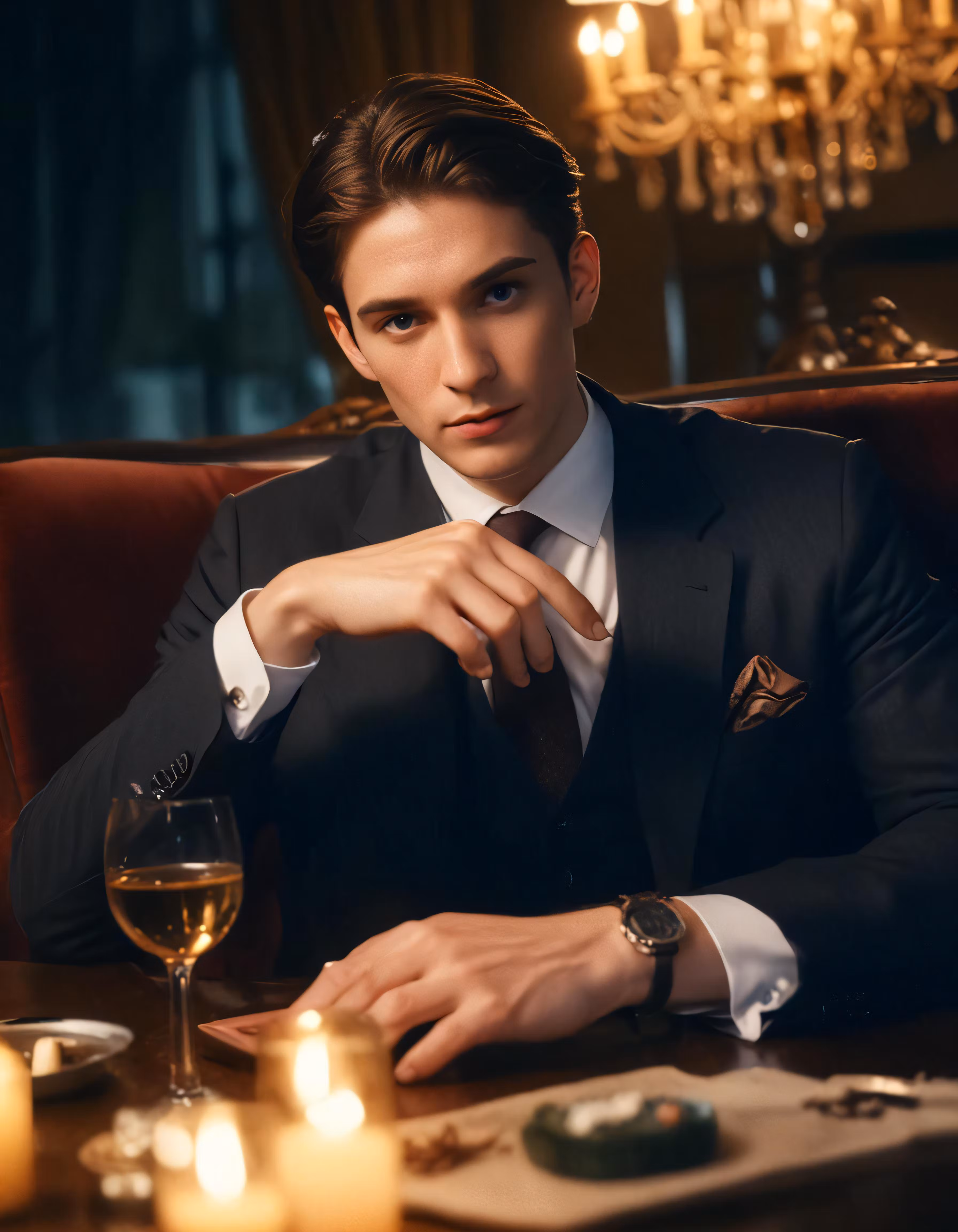 High resolution picture, free to use, a man sits at a table with some candles and a wine glass
