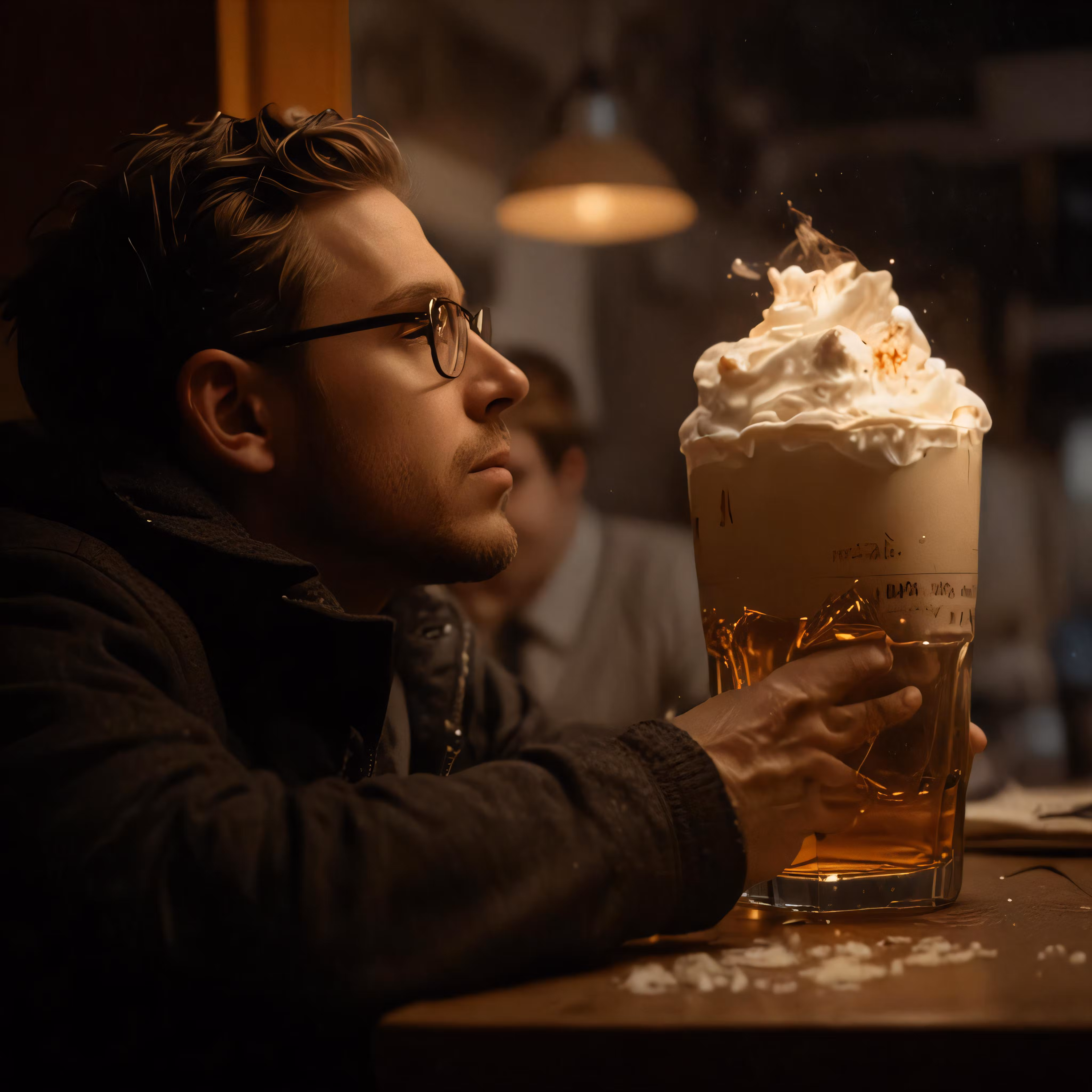 High resolution picture, free to use, a man sitting at a table holding up a glass of coffee