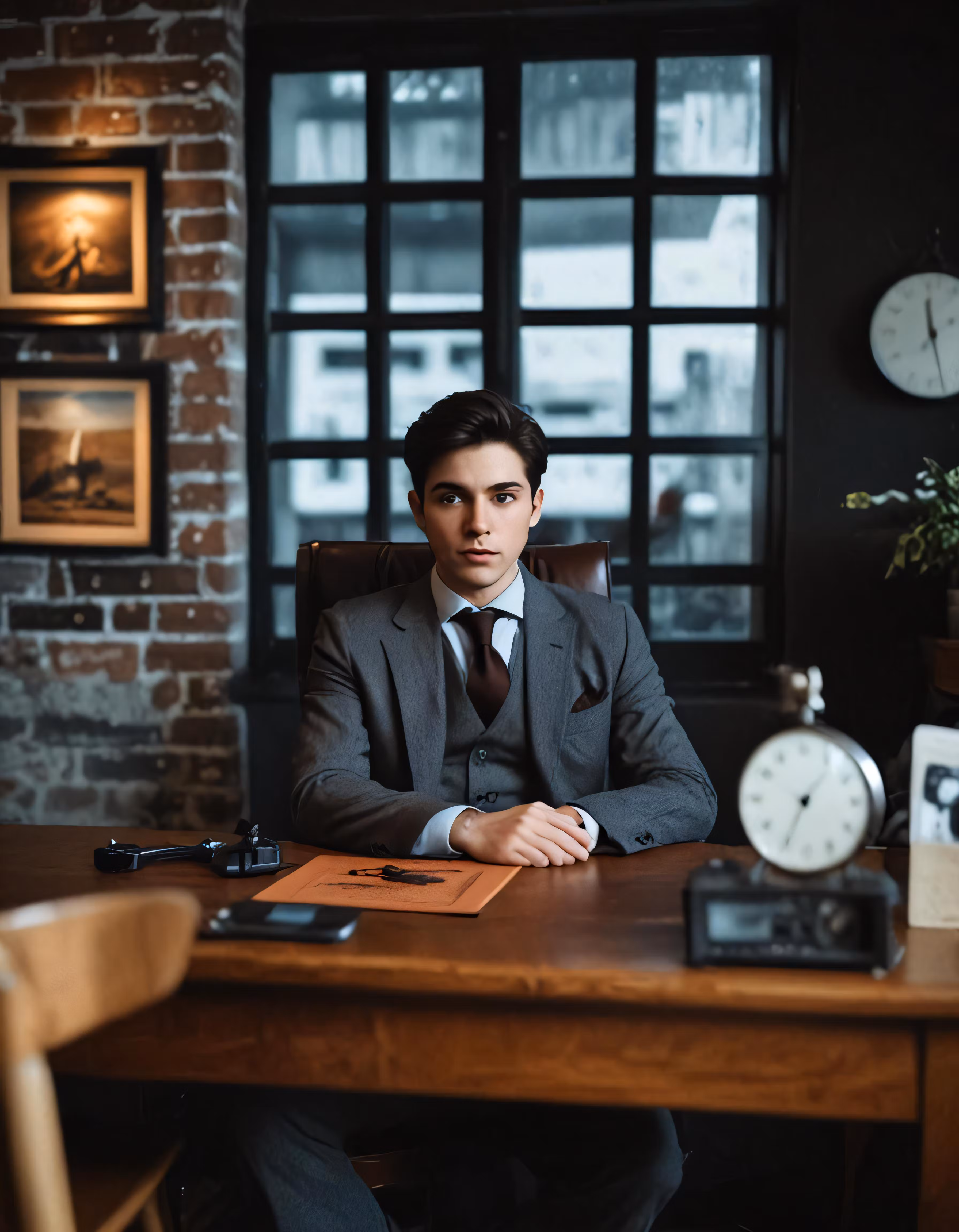 High resolution picture, free to use, a man sitting at a wooden table with his arms folded across his legs