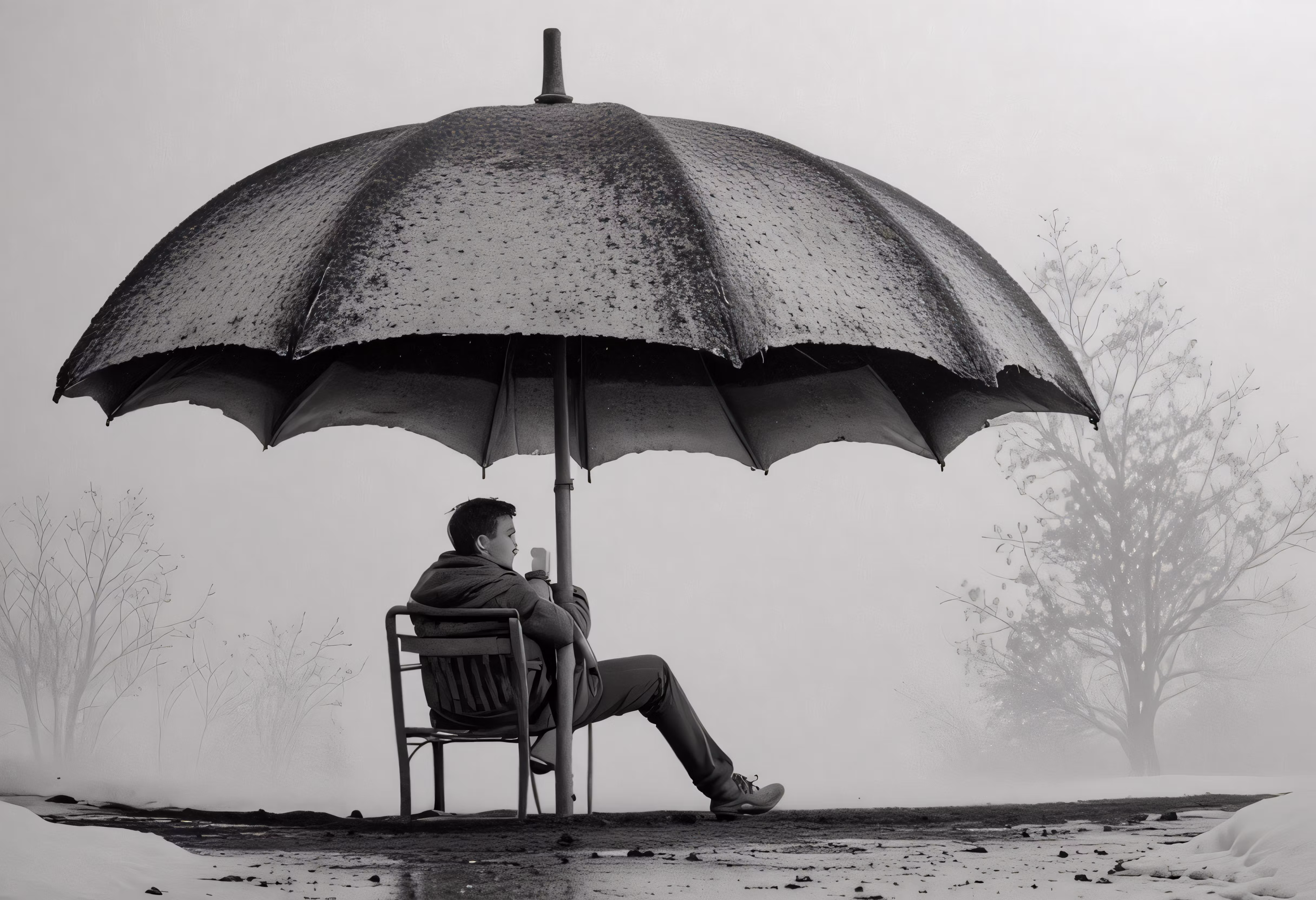 High resolution picture, free to use, a man sitting in a chair with an umbrella over his head