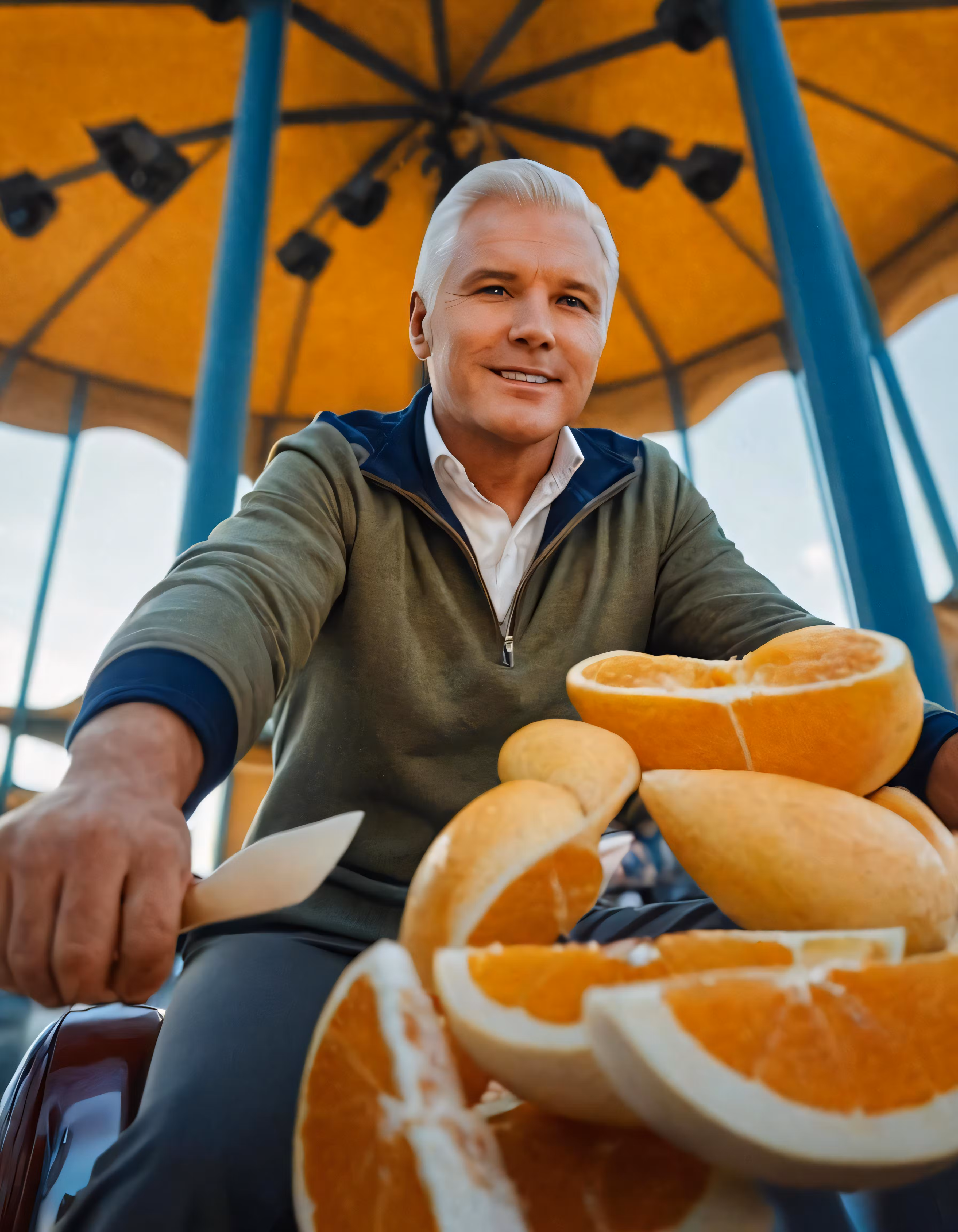 High resolution picture, free to use, a man sitting in front of oranges outside
