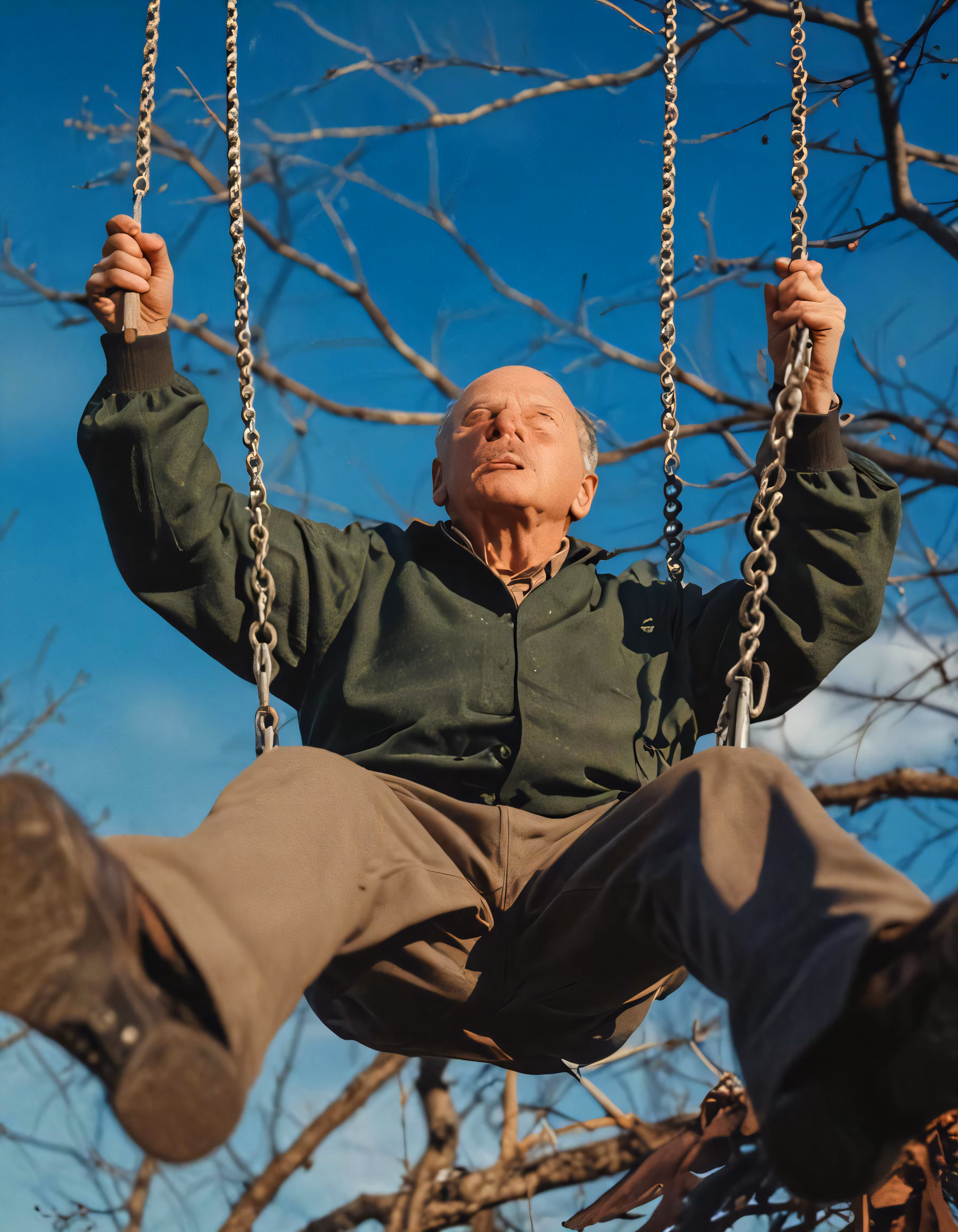 High resolution picture, free to use, a man sitting on a swing in a tree