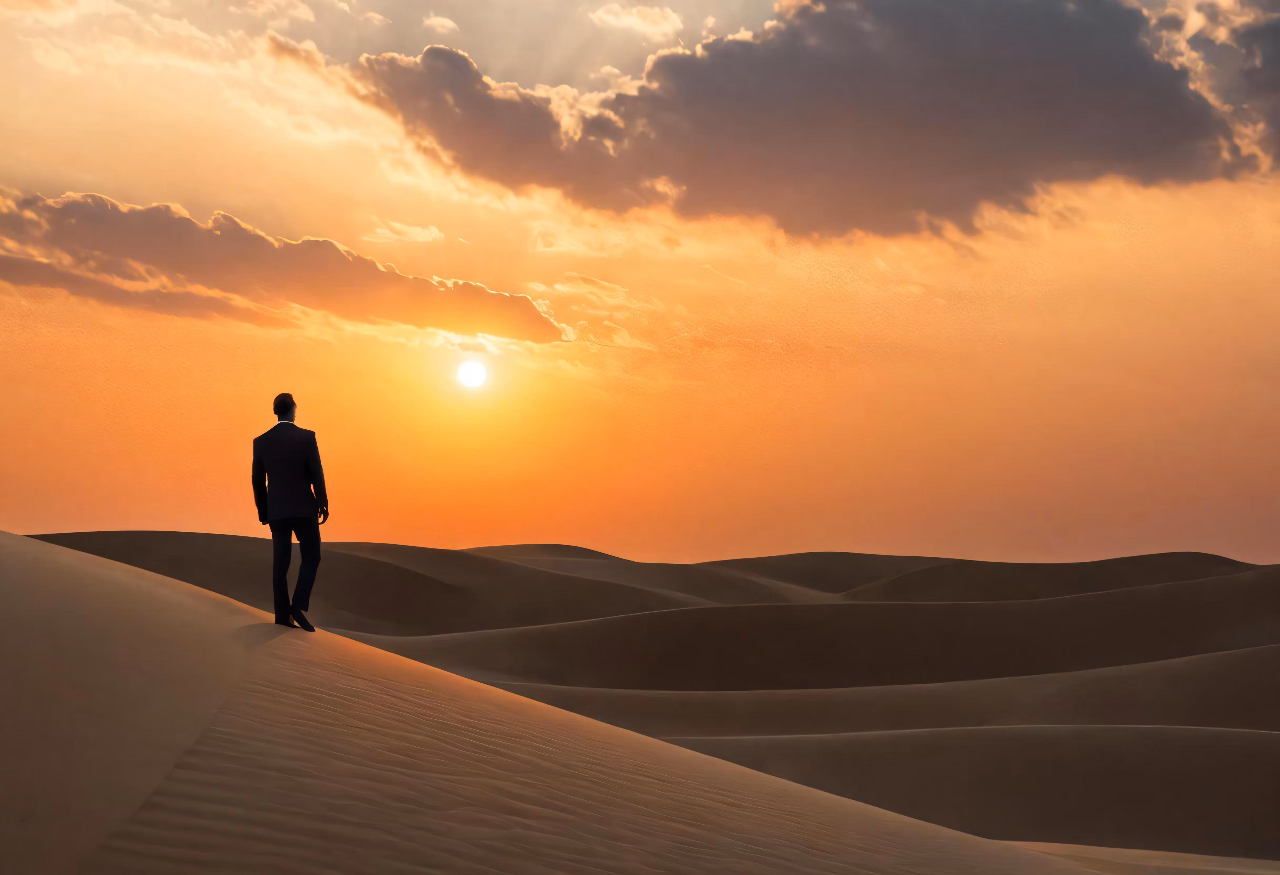 High resolution picture, free to use, a man standing alone on a dune in the desert