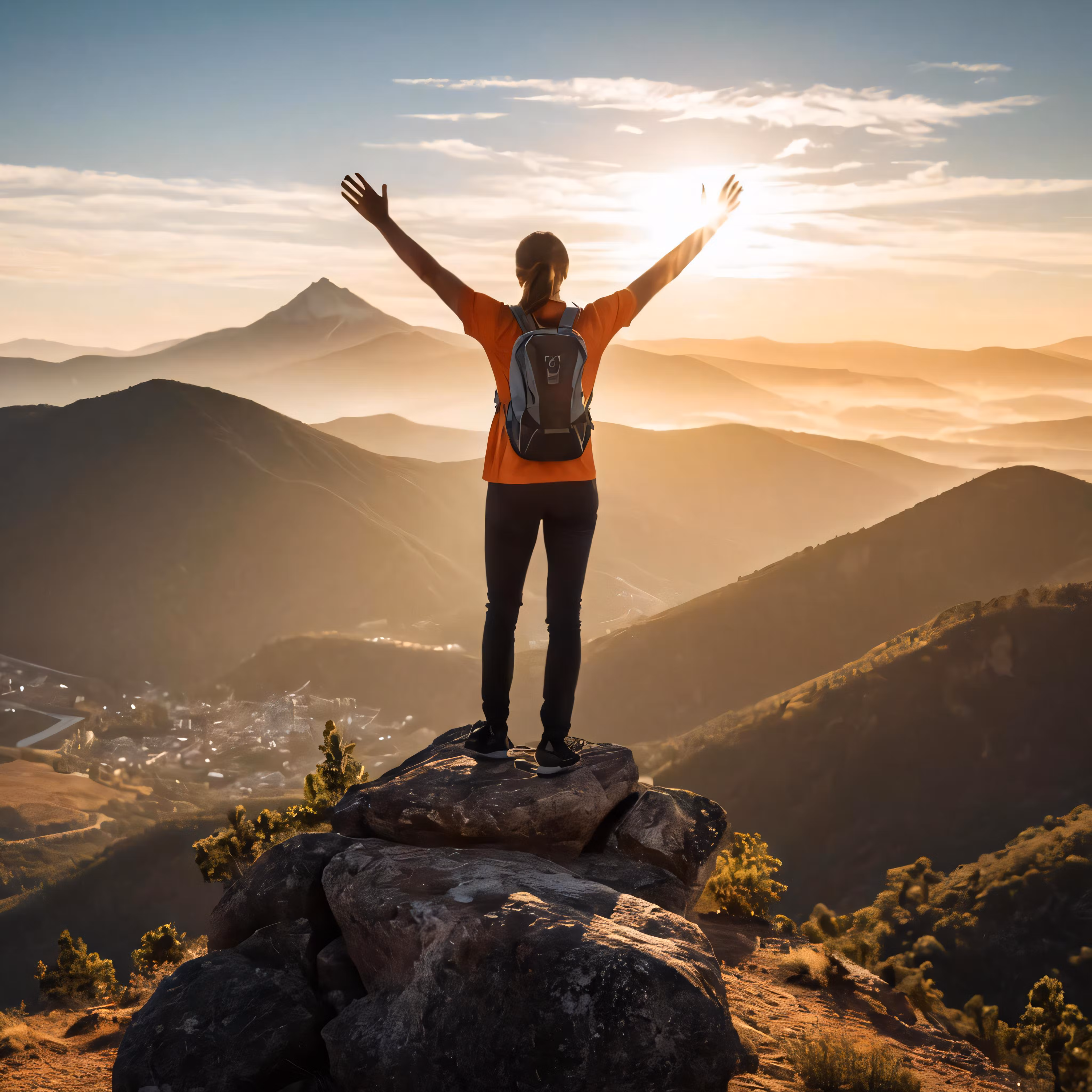 High resolution picture, free to use, a man standing at the top of a mountain while raising his arms