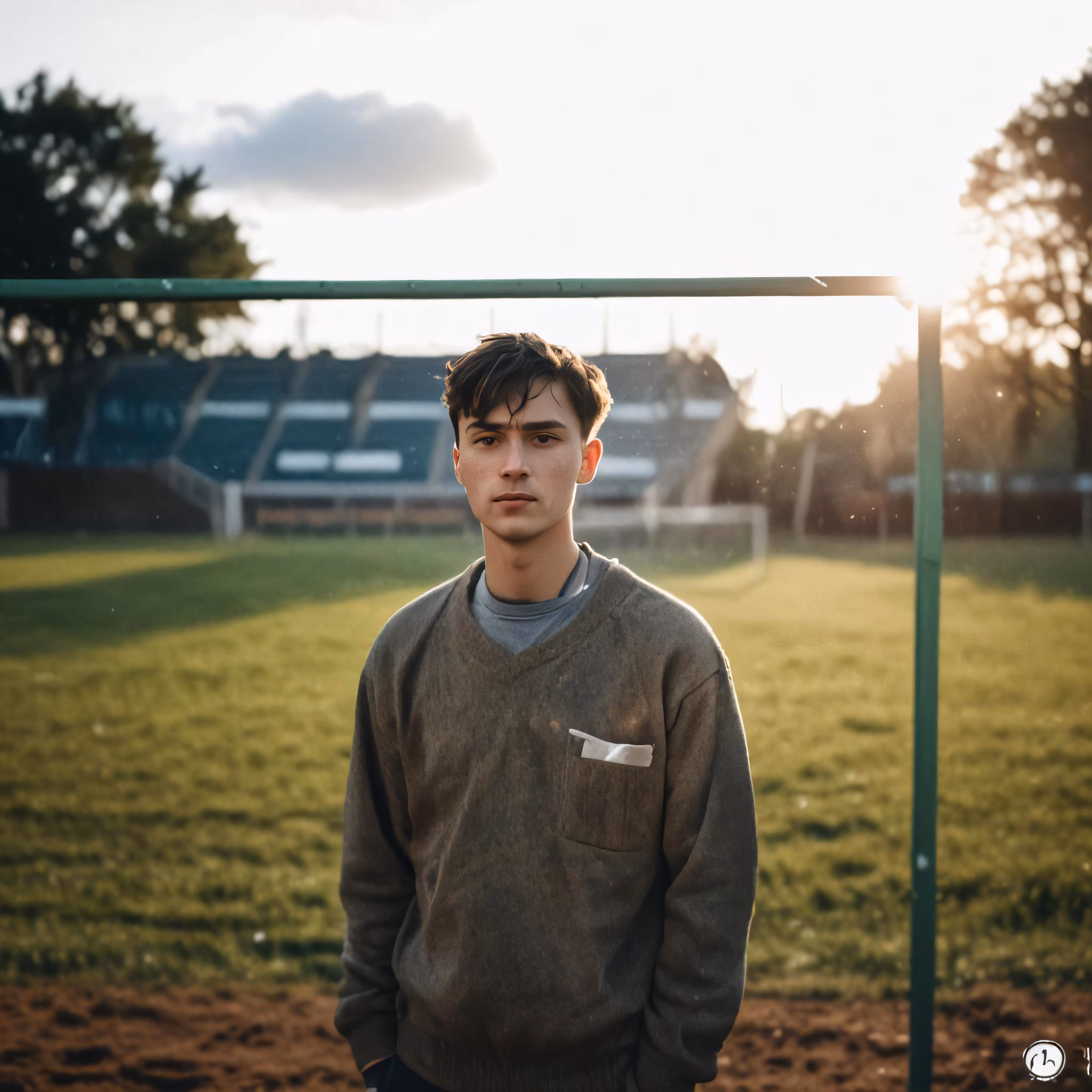 High resolution picture, free to use, a man standing by a soccer field with the sun behind him