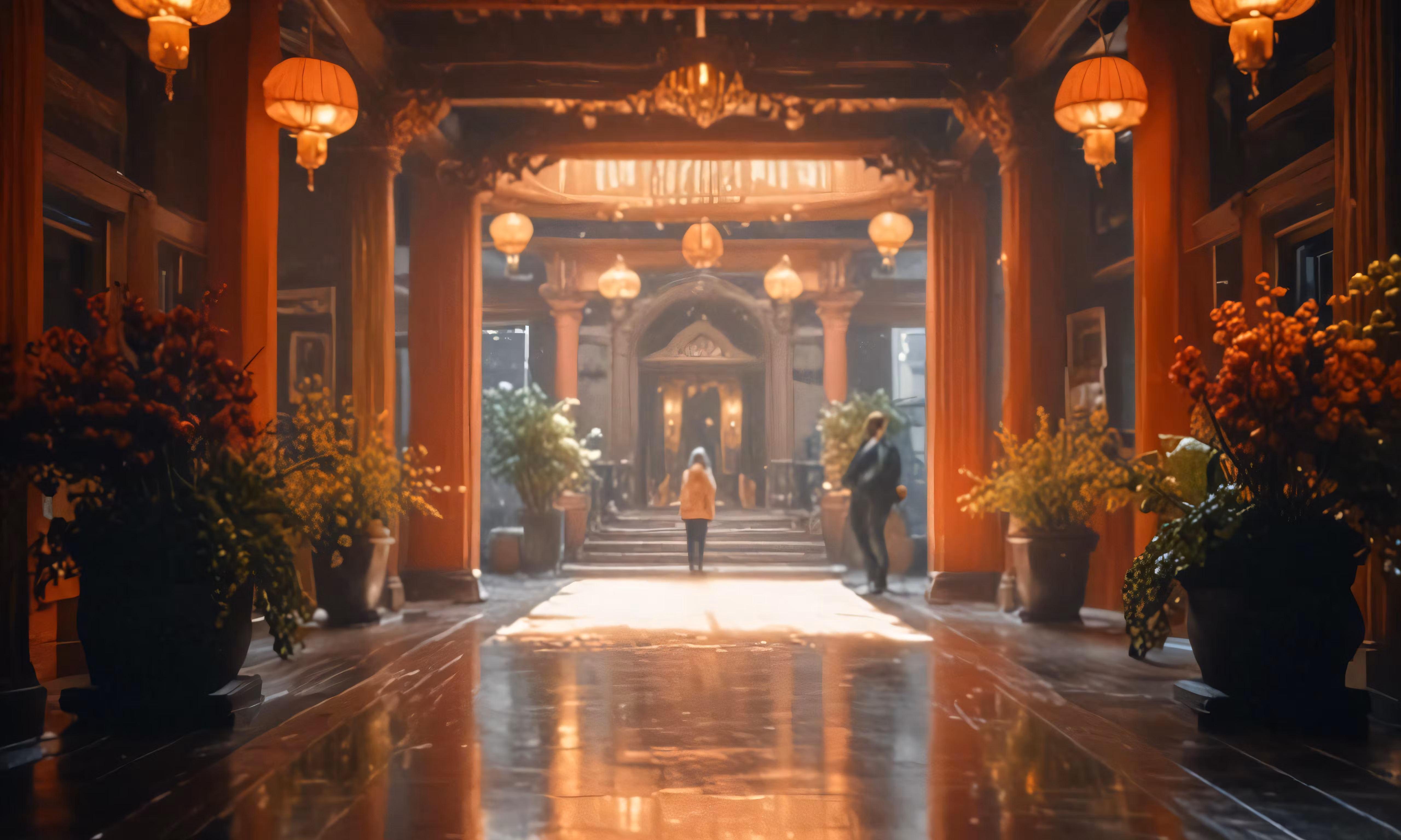 High resolution picture, free to use, a man standing in a lobby with flower pots next to the entrance
