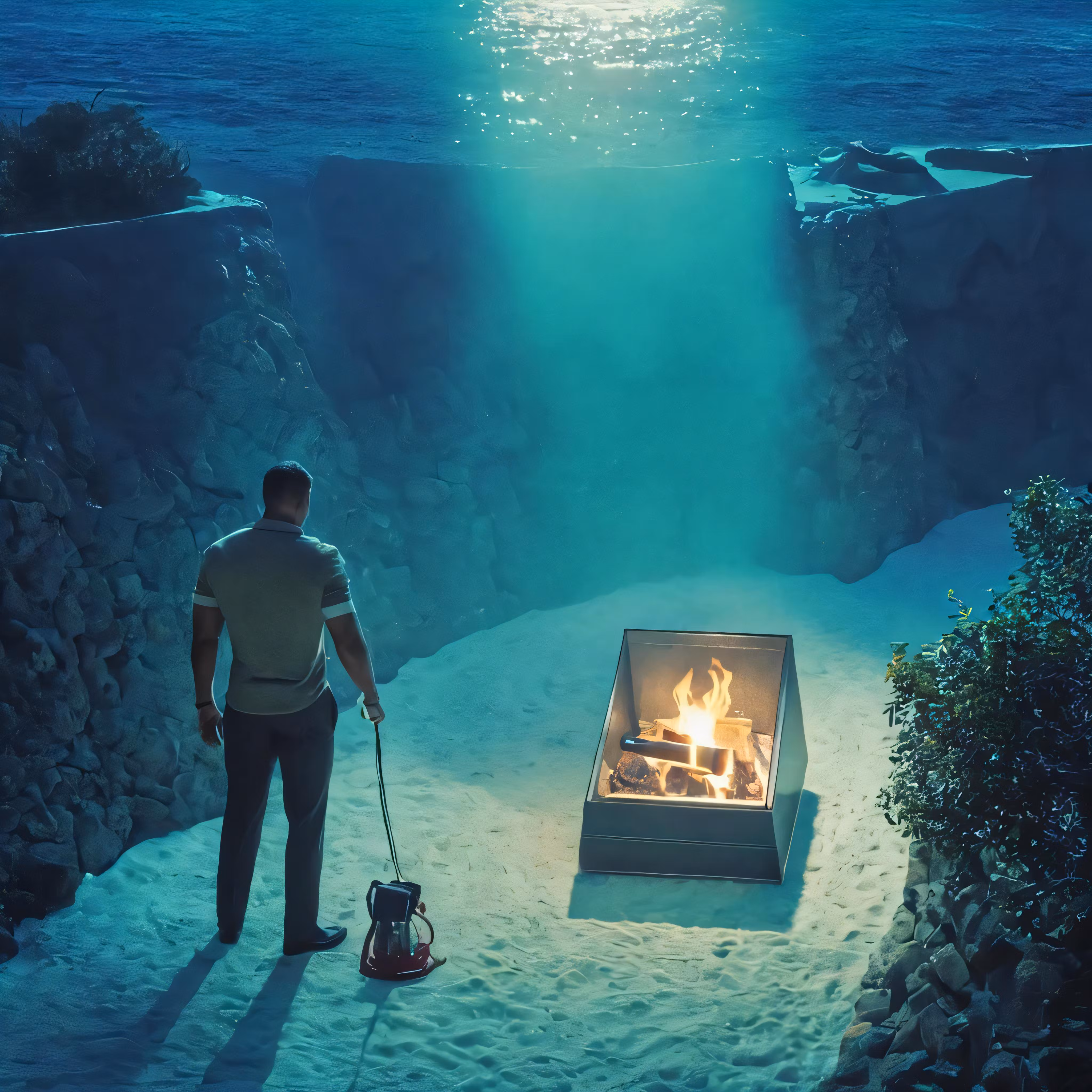 High resolution picture, free to use, a man standing in front of a fire pit