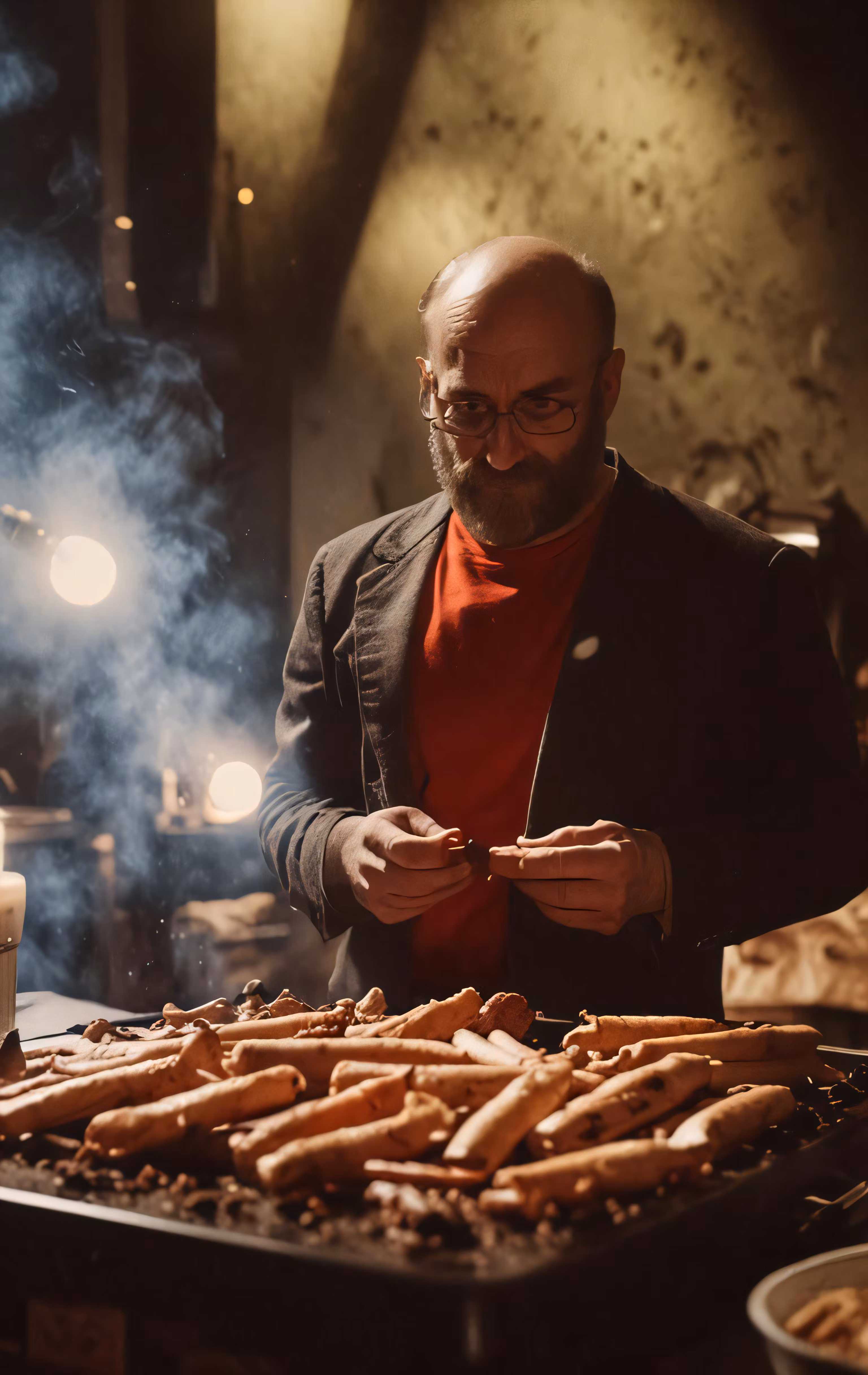 High resolution picture, free to use, a man standing in front of a grill full of hot dogs