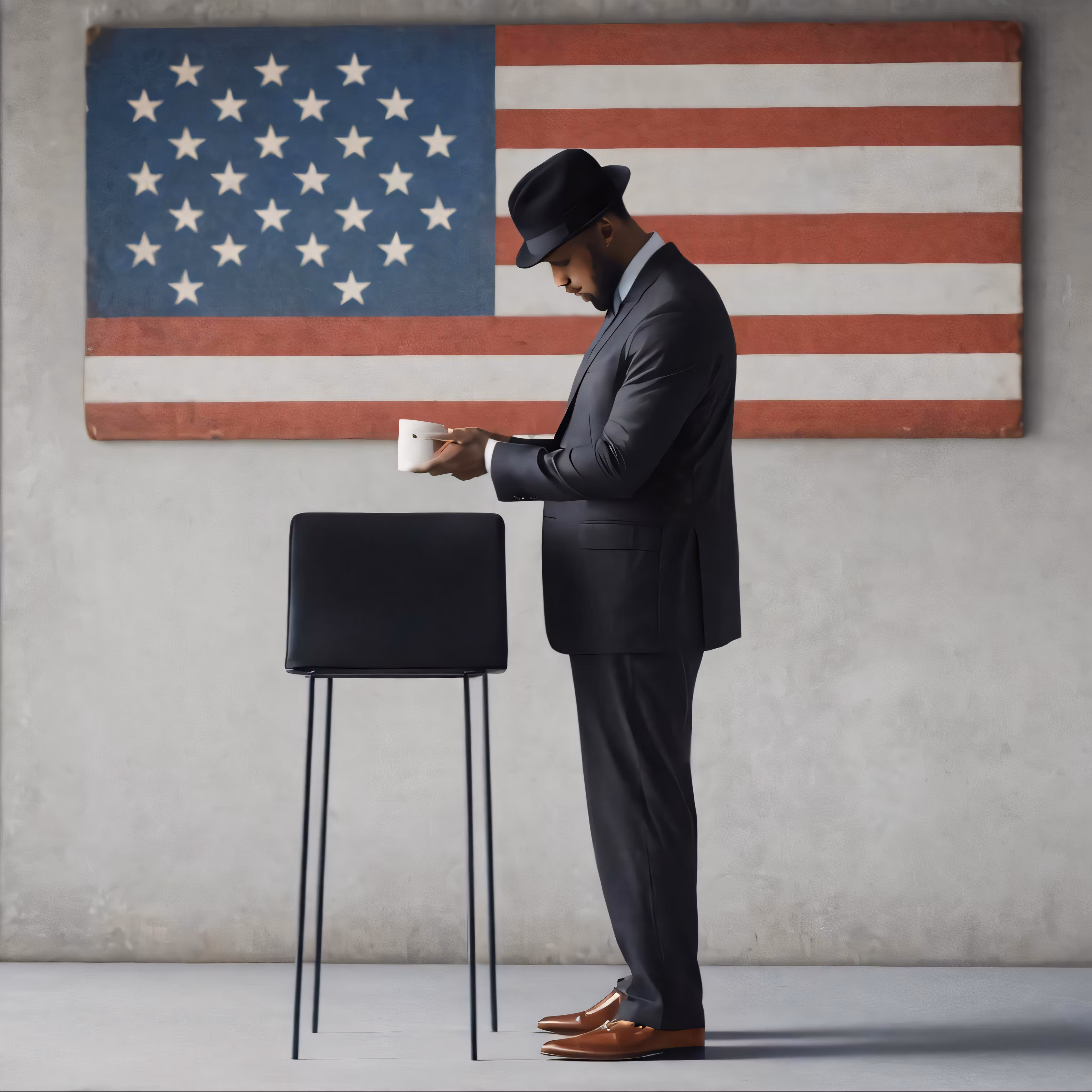 High resolution picture, free to use, a man standing in front of a small chair holding a cup