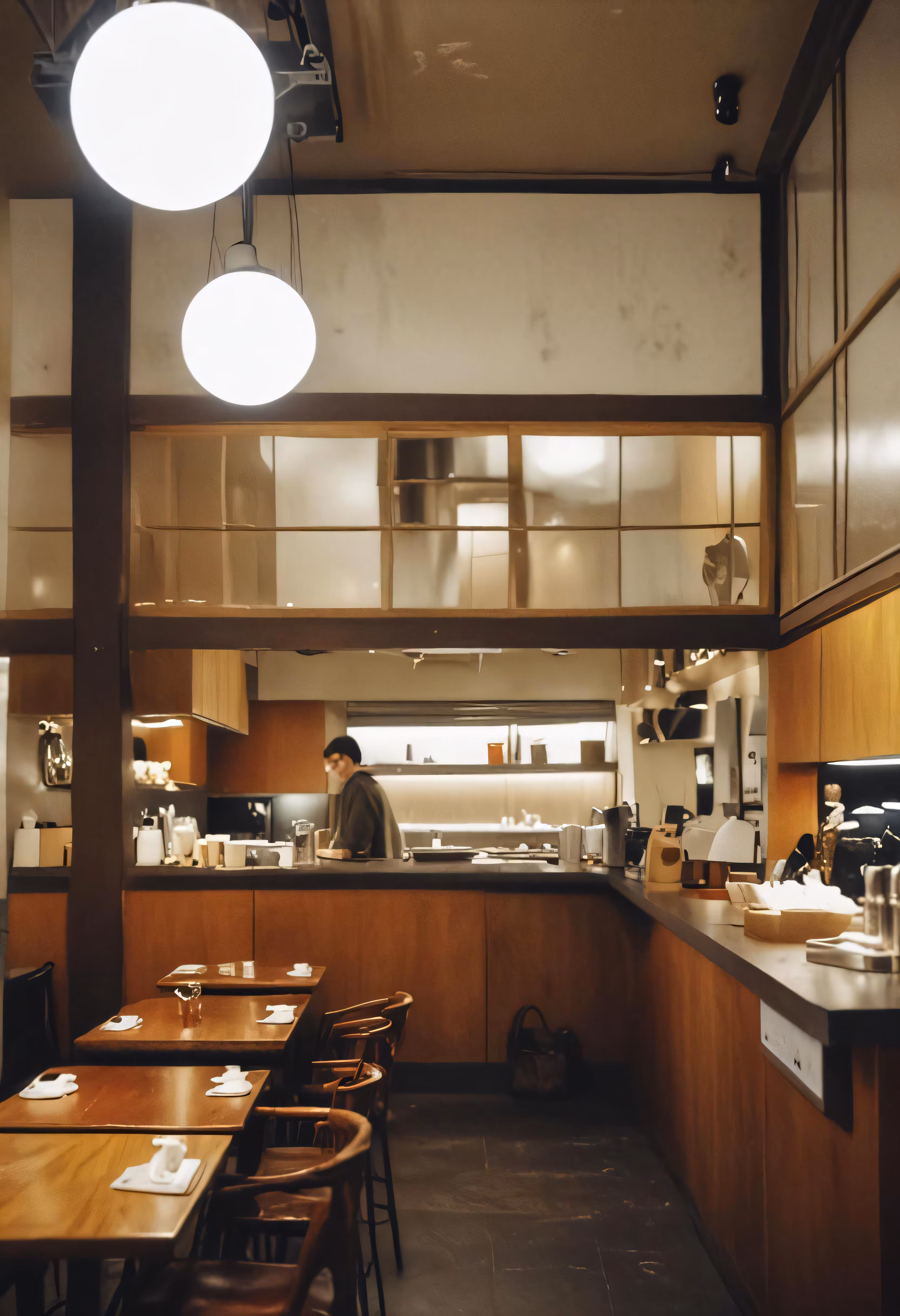 High resolution picture, free to use, a man standing in front of some tables with chairs