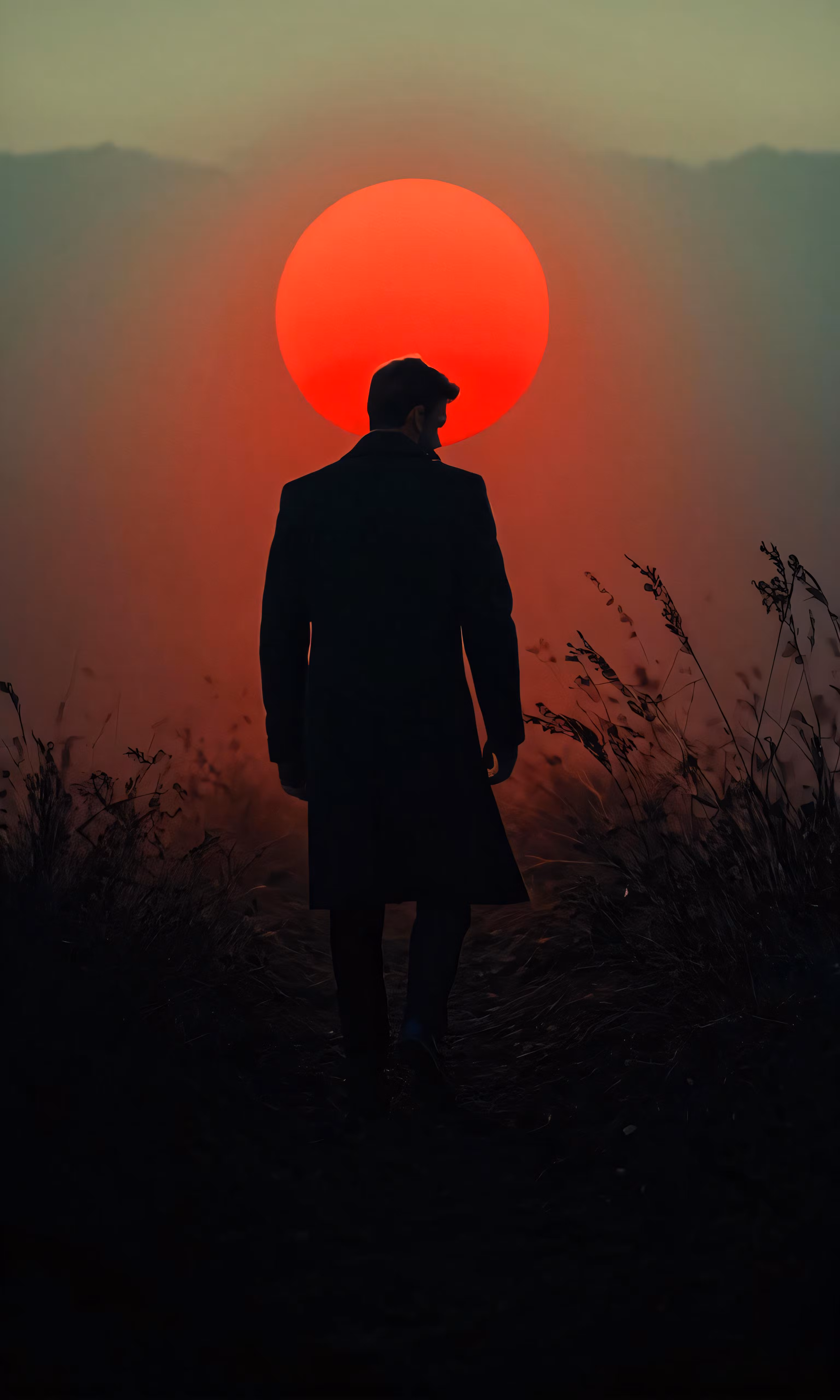 High resolution picture, free to use, a man standing in the fog at sunrise