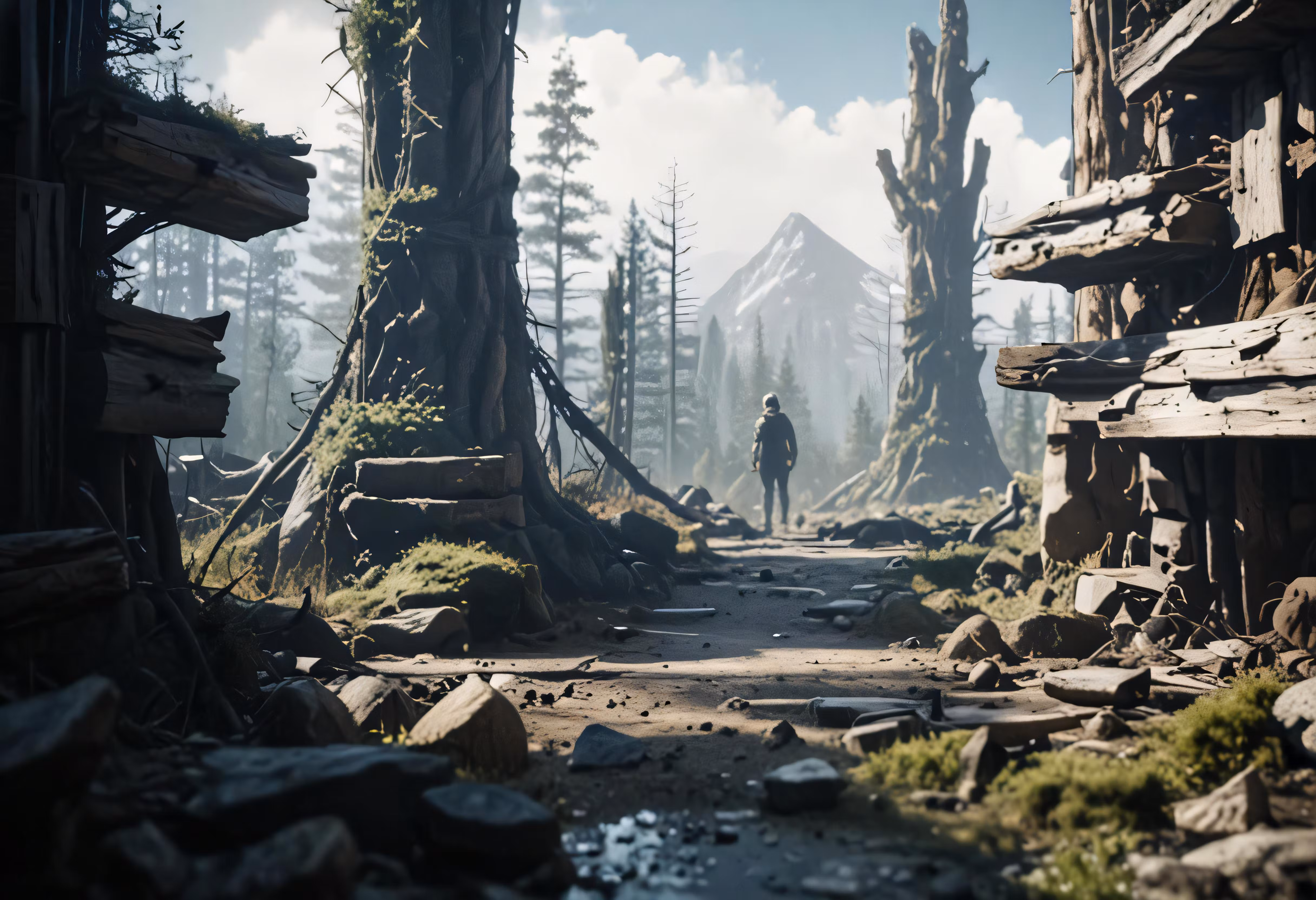 High resolution picture, free to use, a man standing near many trees in a heavily forested area