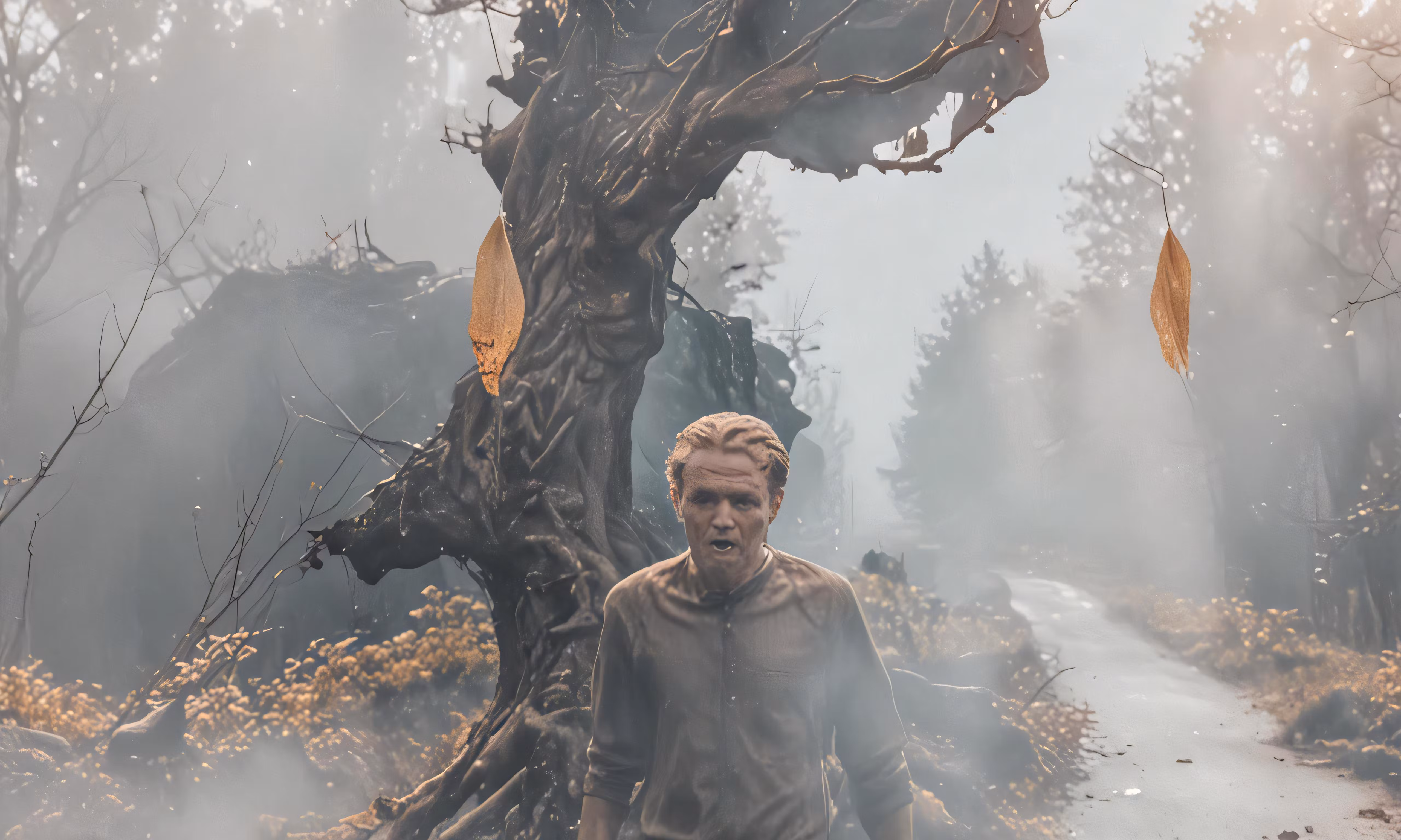 High resolution picture, free to use, a man standing next to a tree in the fog